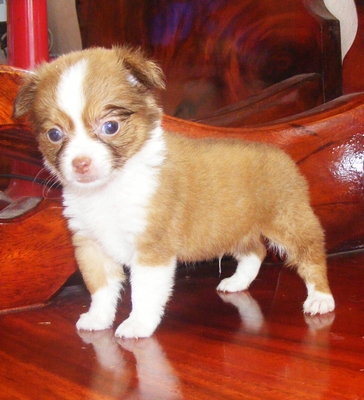 ชิวาวาขนยาว เพศผู้ แฟนซี น้ำตาล-ขาว มาร์คสวย หัวโหนกสวย