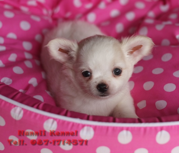 ชิวาวาเพศผู้ ขนยาวหนานุ่ม สีขาวแต้มครีมนิดๆ พร้อมใบเพ็ด ราคาน่าร๊าก!
