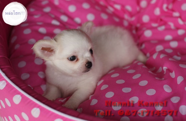 ขายชิวาวาเพศผู้ ขนยาวหนานุ่ม สีขาว พร้อมใบเพ็ด ราคาถูก!!!