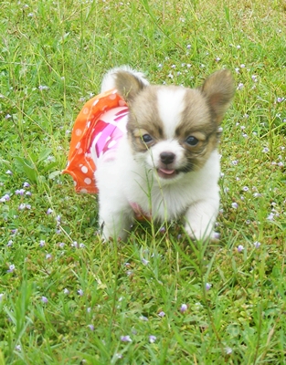 น้องชิวาวาขนยาว เพศเมีย แฟนซี สีขาว-น้ำตาล ตัวจิ๋ว อายุ 50 วัน