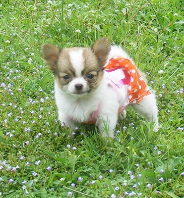 น้องชิวาวาขนยาว เพศเมีย แฟนซี สีขาว-น้ำตาล ตัวจิ๋ว อายุ 50 วัน