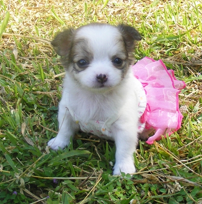 น้องชิวาวาขนยาว เพศเมีย แฟนซี สีขาว-น้ำตาล ตัวจิ๋ว อายุ 50 วัน