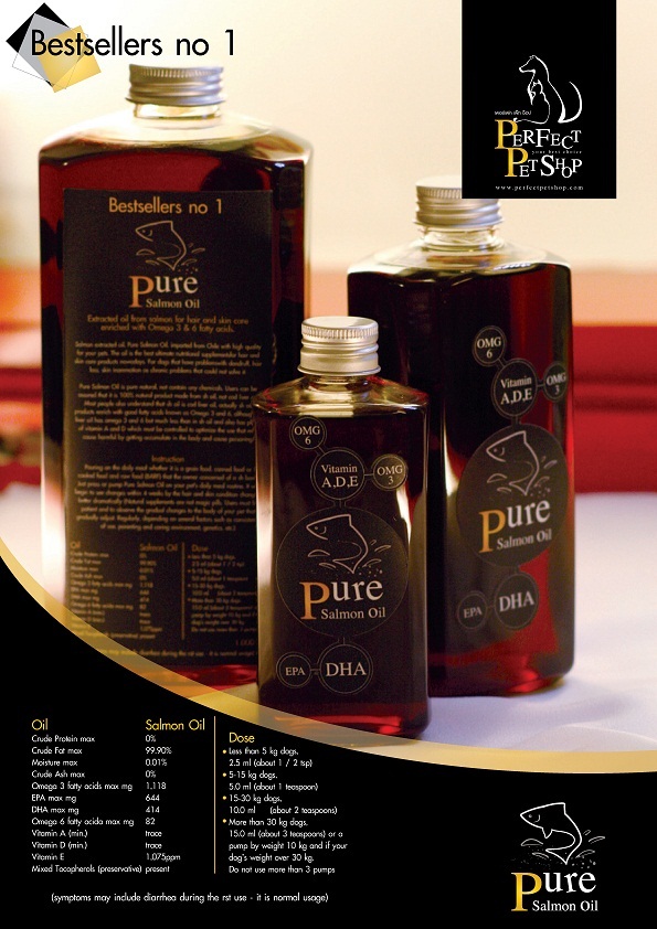 น้ำมันปลาสกัดจากแซลมอนสกัดแท้ๆจากธรรมชาติปราศจากสารเคมีและสิ่งปนเปื้อน Pure Salmon Oil สุดยอดผลิตภัณฑ์อาหารเสริม บำรุงขน และผิวหนังที่ดีที่สุด เป็นสินค้าขายดีอันดับ 1 เป็นที่ยอมรับของคอกและฟาร์มเลี้ยงหลายแห่งที่นิยมนำไปใช้กับสุนัขประกวดซึ่งนอกจากช่วยเรื่องบำรุงขนและผิวหนังแล้วยังช่วยเรื่องโรคหัวใจขาดเลือดเพราะจะช่วย ลดไขมันในเลือดได้ซึ่งเป็นบ่อเกิดในการทำให้เกิดโรคเส้นเลือดอุดตัน และยังช่วยบำรุงเสริมสร้างเซลล์สมองให้กับพวกเค้าเพราะเซลล์สมองมีกรด
