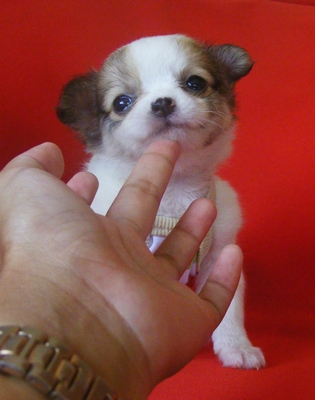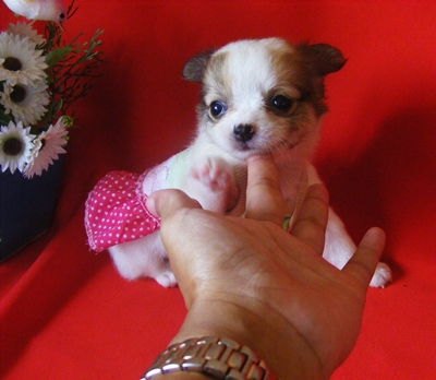 น้องชิวาวาขนยาว เพศเมีย แฟนซี สีขาว-น้ำตาล ตัวจิ๋ว อายุ 50 วัน