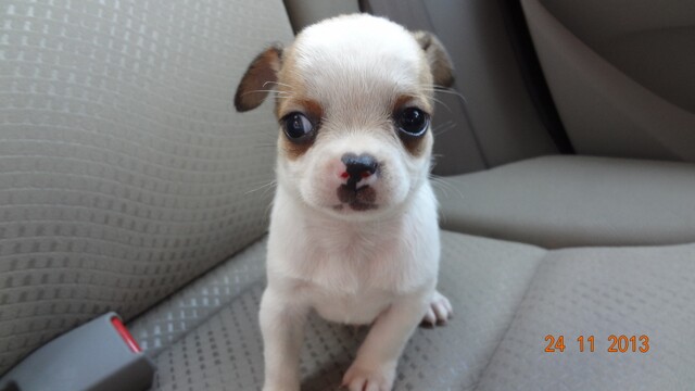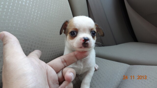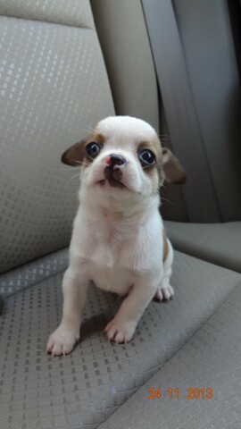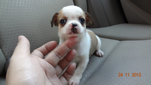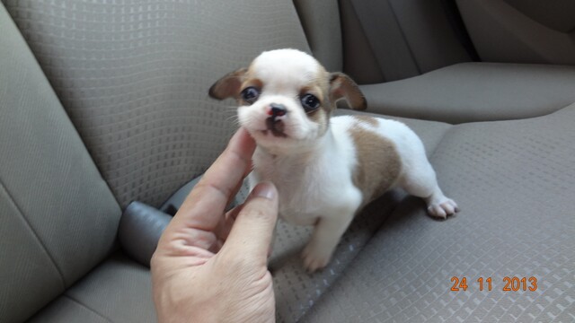 ชิวาวาเพศผู้ สีขาวน้ำตาลไซด์เล็ก ตัวสั้นเตี้ยขาสั้น 4000 บาท