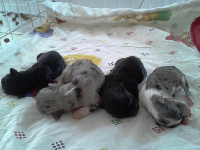 สองรูปสุดท้าย เป็นลูกสุนัขที่ได้จากการผสมกับแม่สีขาว ดำ แต่มีคิ้วมีคางสีน้ำตาล