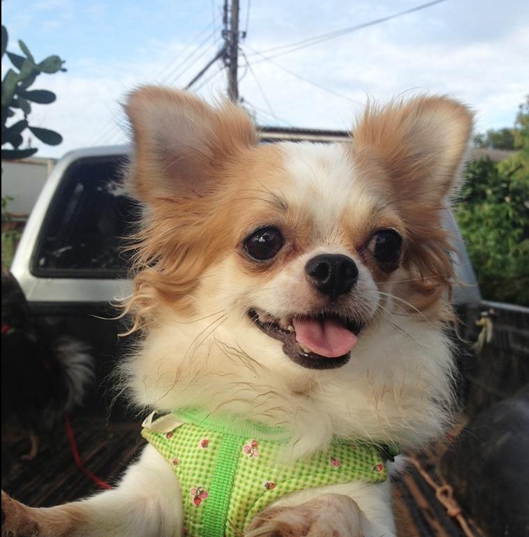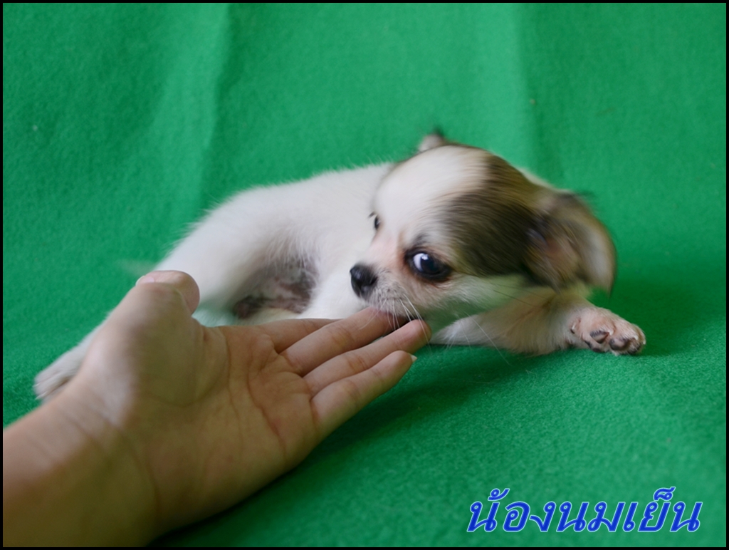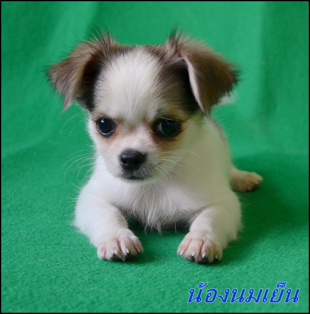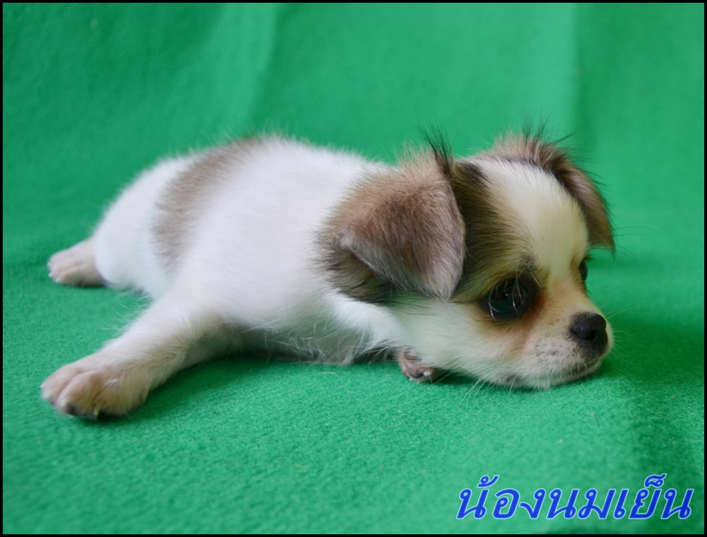 "น้องนมเย็น" ชิวาว่าขนยาว เพศเมีย ขาว-น้ำตาล หัวกลม มีสายเลือดไทยแชมป์