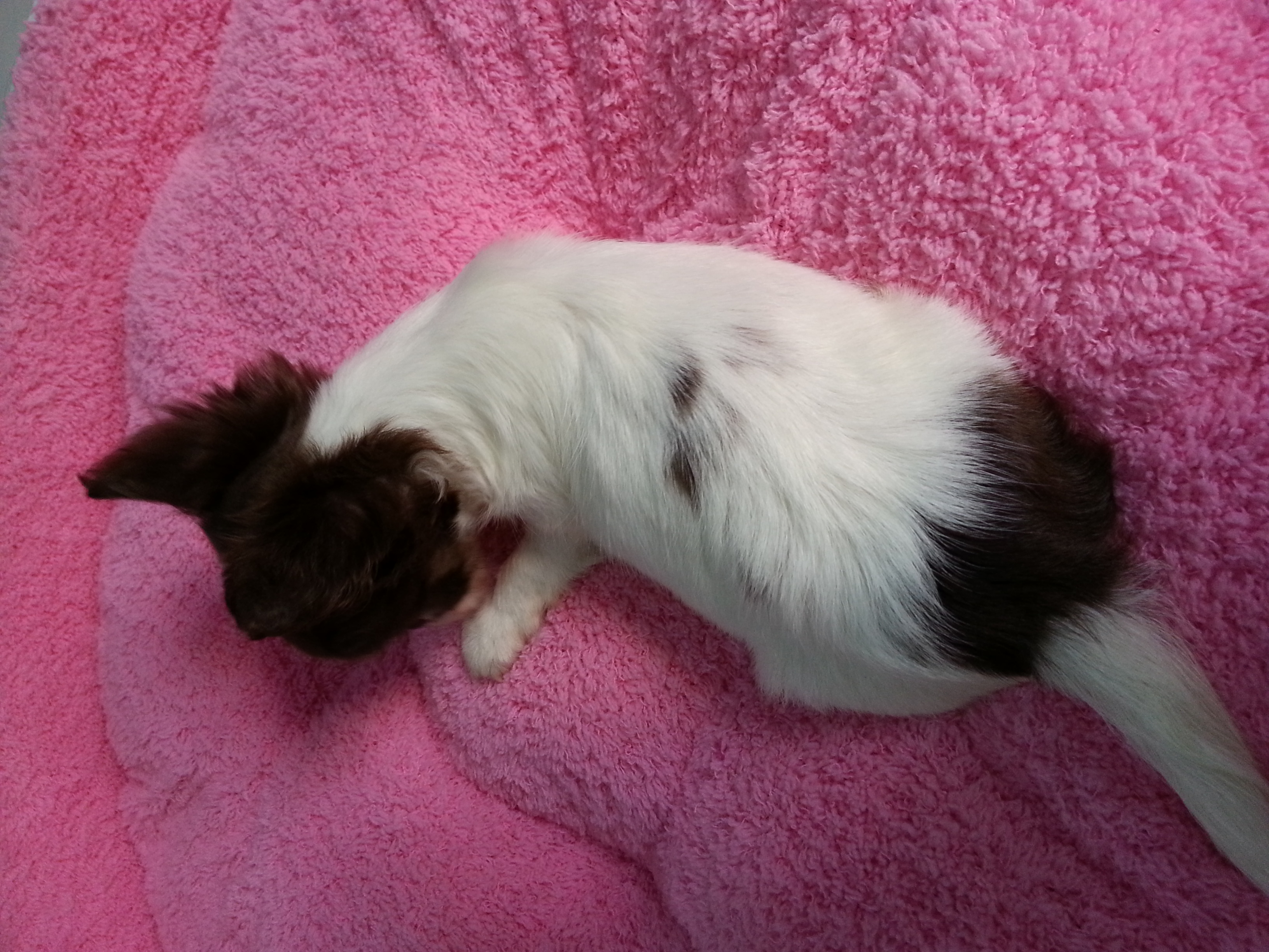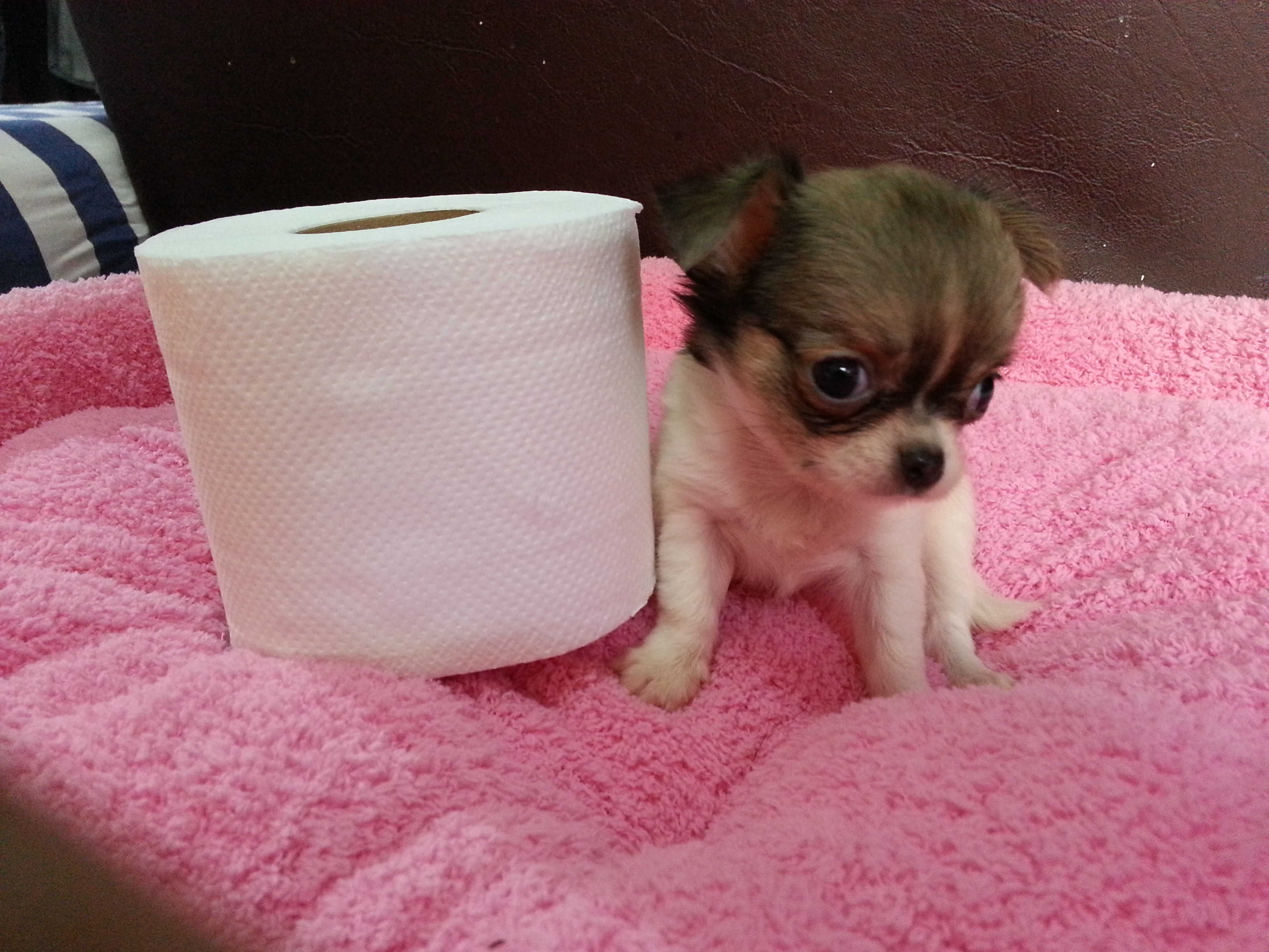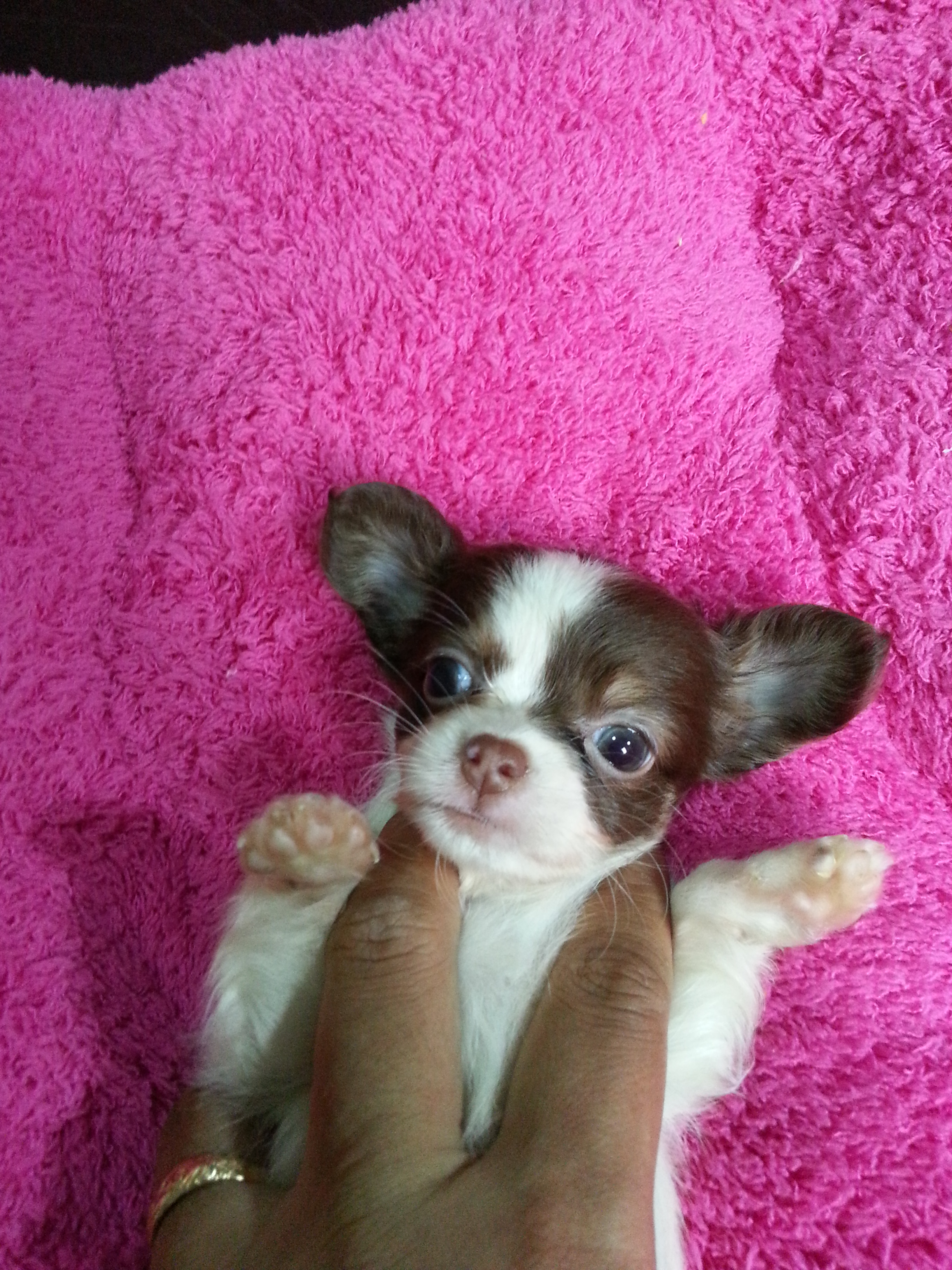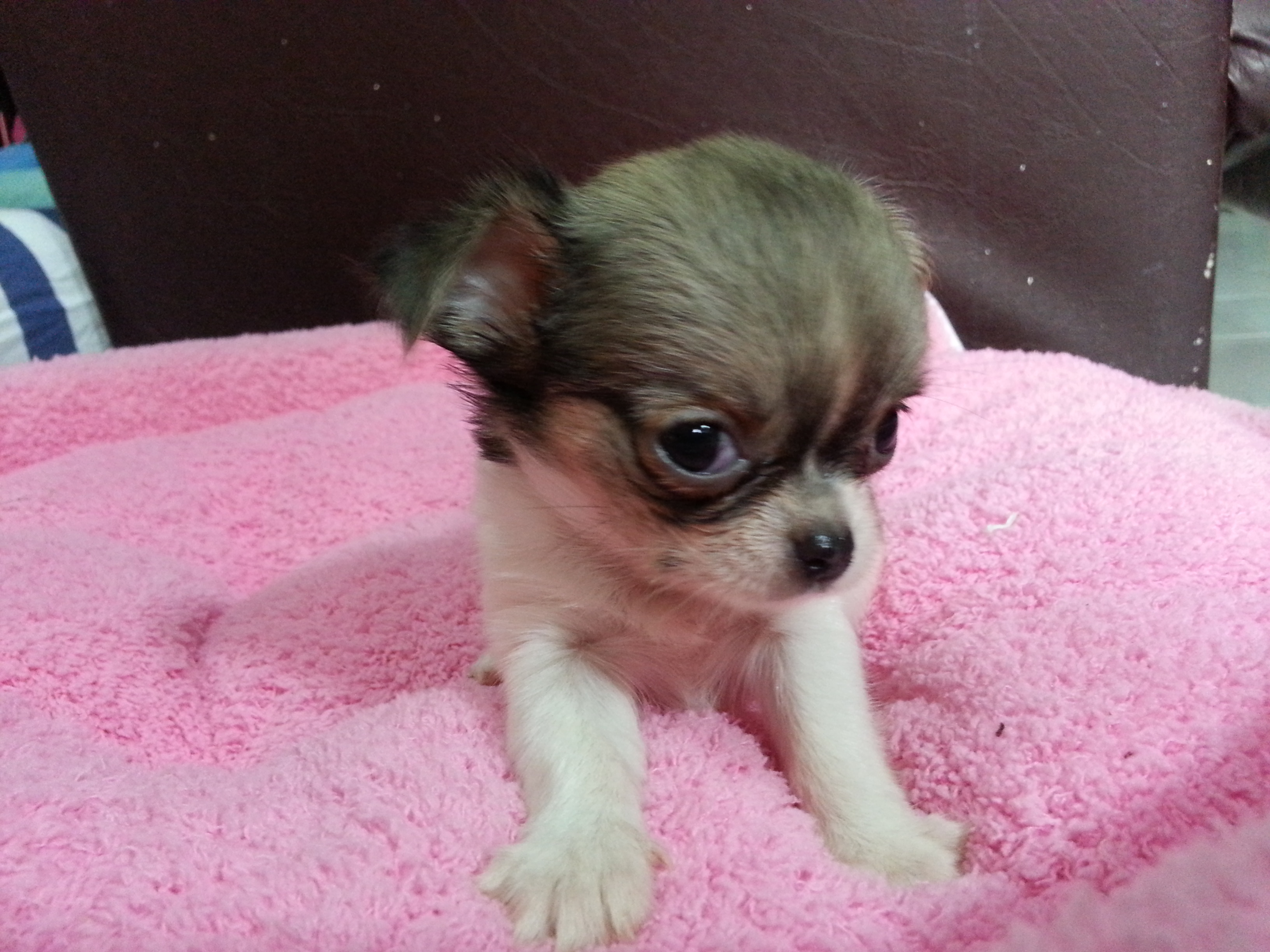 ชิวาวาผู้หญิงขนยาว สีไวทชอคแทน มีคิ้ว ร่าเริง ขี้เล่นตลอดเวลา กินอาหารเม็ด