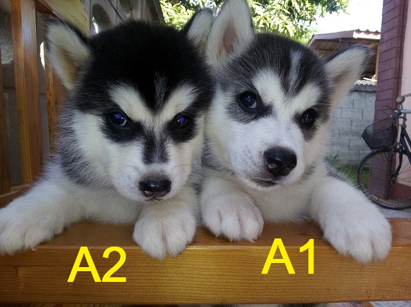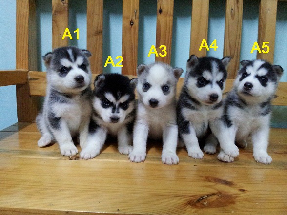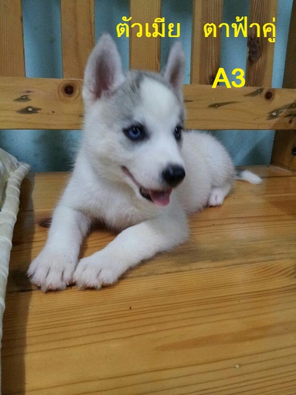 A1,A2 ตัวผู้ สีดำ - ขาว ตาดำ A3 ตัวเมีย สีเทา - ขาว ตาฟ้าคู่