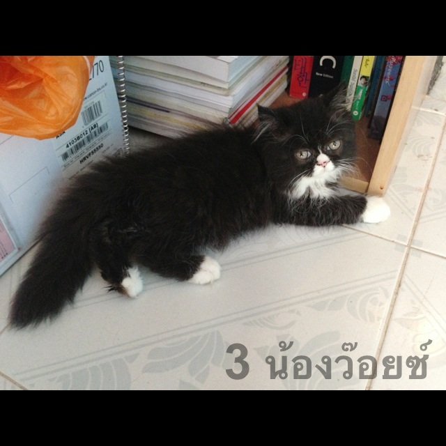 ตัวที่3 น้องว๊อยซ์ ดำ-ขาว ขนปลอกคอ จมูก ถุงมือถุงเท้า ช่วงท้องขาวค่ะ (น้องน่าจะพลัดขนเป็นสีเทาเข้มค่ะ เพราะพ่อน้องสีขาว-เทาตอนนี้น้องมีขนสีขาวขึ้นแซมทั้งตัวเลยค่ะ ขนยาวตรง) (ราคา 6000 บาท)