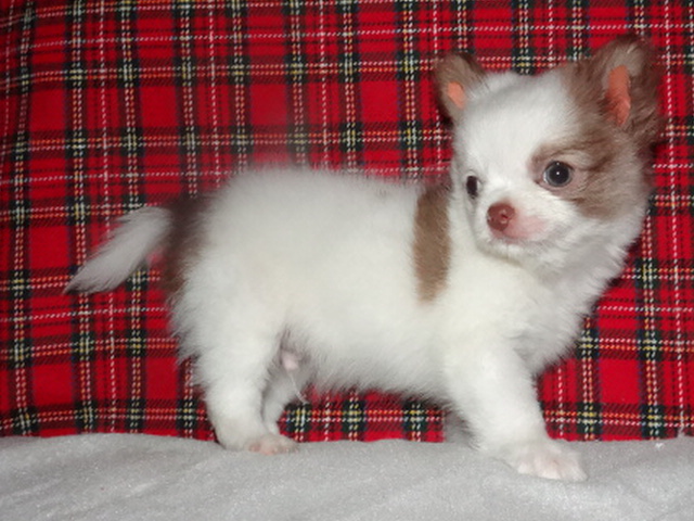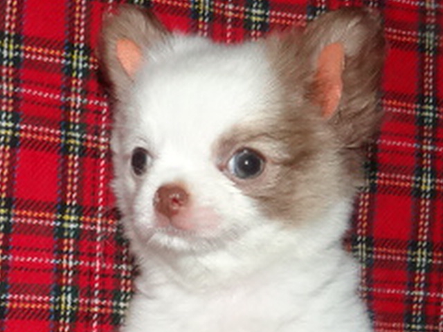น้องปาร์ตี้ ชิวาวาขนยาวสีขาวแต้มช็อกโกแลตแทนหัวโหนกสูง