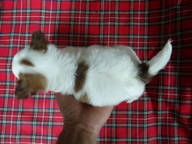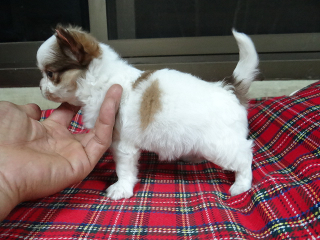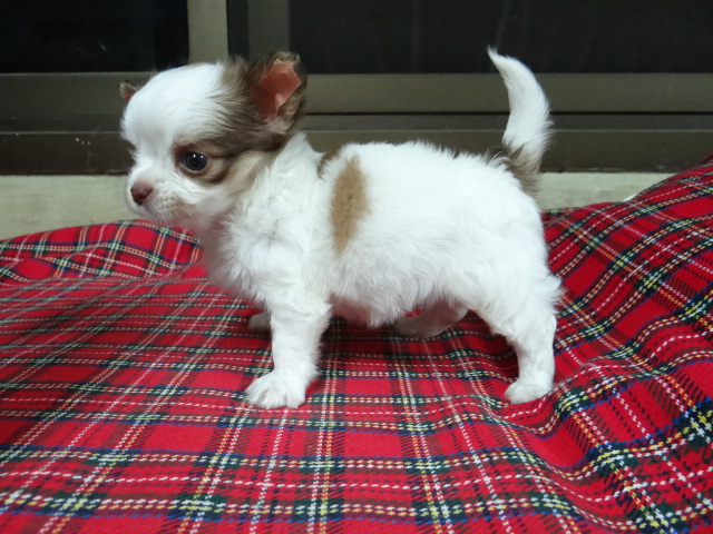 น้องคิตตี้ ชิวาว่าขนยาวเพศเมียสีขาวแต้มช็อกโกแลต