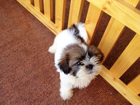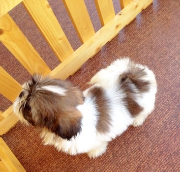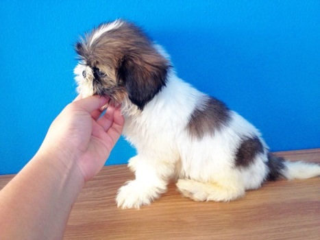 ชิสุทีคััพเพศเมีย สีขาว น้ำตาลเข้ม อายุเกือบ 3 เดือน ตัวเล็กจริง