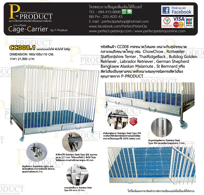 เป็นกรงรุ่นพับไม่ได้ แยกประกอบไม่ได้ และไม่มีมุ้งลวด แต่มาพร้อมอุปกรณ์มาตรฐานเป็นล้อ Superlene nylon เกรดA และถาดรองสิ่งสกปรก ผลิตขึ้นจากสเตนเลสหนาพิเศษเหมาะกับสุนัขขนาดกลางจนถึงขนาดใหญ่ เช่น Bulldog,ChowChow,Bangkaew,Staffordshire Terrier,Thai RidgeBack,Golden Retriever,Labrador Retriever,Rottweiler,German Shepherd,Alaskan Malamute หรือสัตว์เลี้ยงที่มีขนาดเหมาะสมทุกชนิดกรงสัตว์เลี้ยงคุณภาพจาก P-PRODUCT