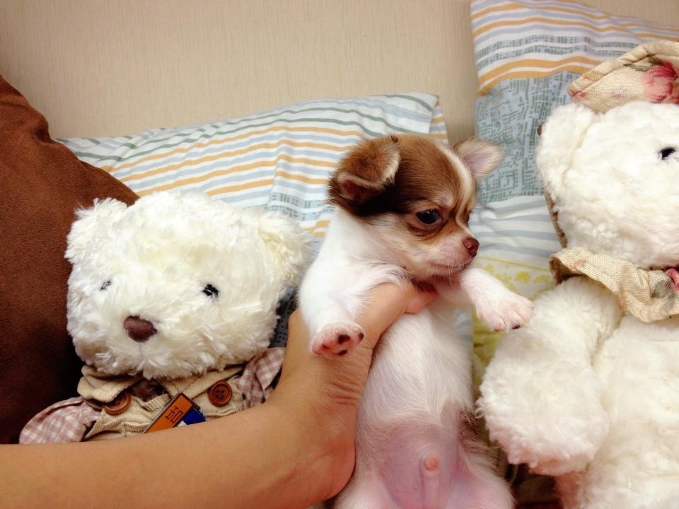 ชิวาวาขนยาว(น้องมอคค่า)สายใต้หวัน สีขาว-น้ำตาลช๊อก หน้าสั้น หัวแอปเปิ้ล ไซด์เล็ก