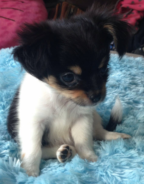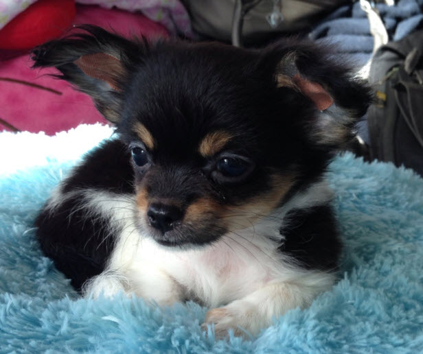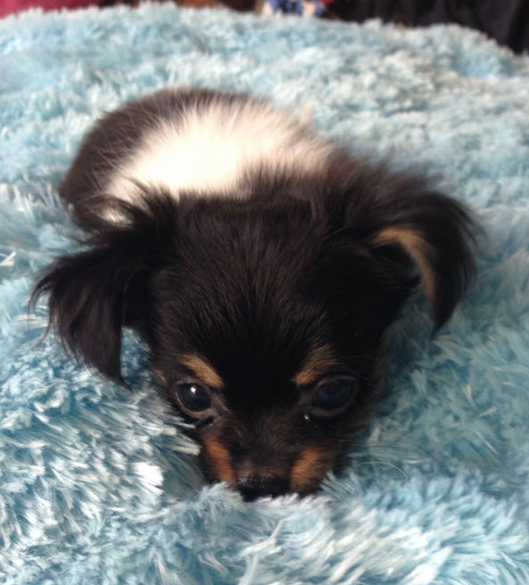 ขายชิวาว่าขนยาว สีแฟนซี ขาว-ดำ เพศผู้ อายุ 2 เดือน พร้อมใบเพ็ด