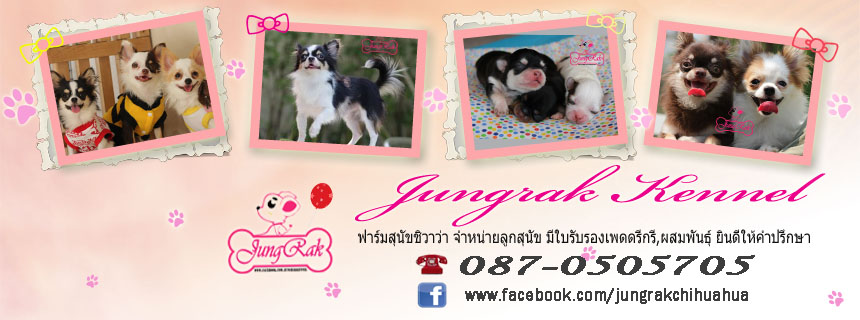 Jungrak Kennel ฟาร์มสุนัข Chihuahua มาตรฐานฟาร์ม 100% เรามีลูกสุนัขน่ารักๆให้ท่านเลือก มีบริการส่งฟรีทั่วประเทศสำหรับลูกค้าต่างจังหวัด อยากใด้ Chihuahua น่าร๊ากน่ารักเชิญเยี่ยมชมนะคับ Jungrak Kennel โทร 087-050-5705