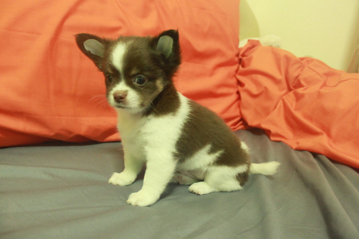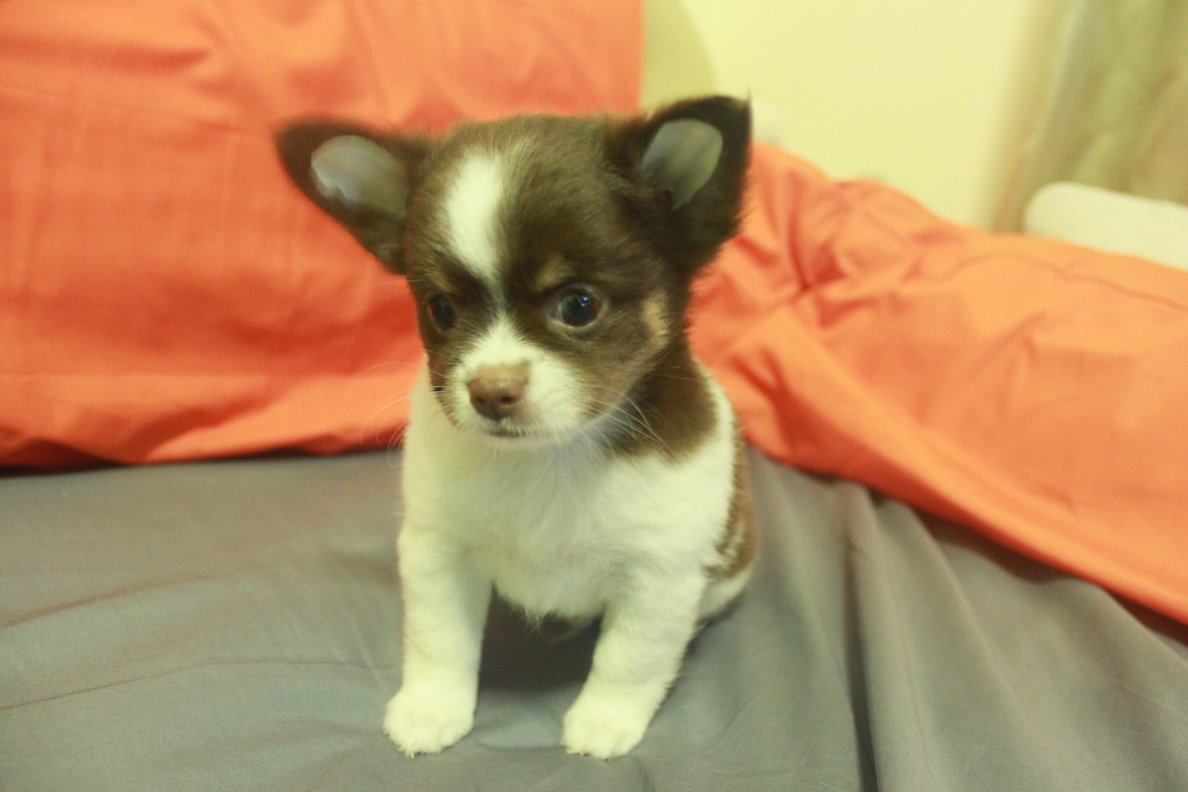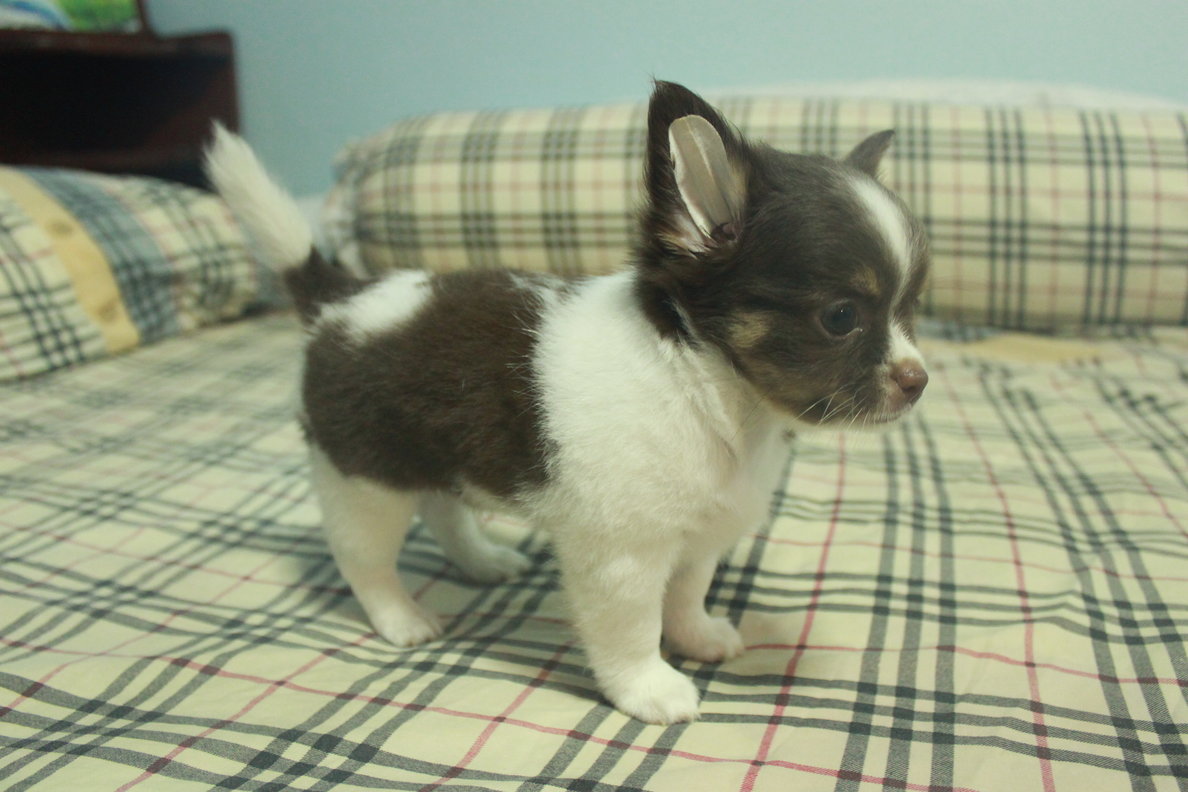 จำหน่ายลูกสุนัขชิวาวาขนยาว สายพันธุ์แท้ เพศผู้ สีขาวช๊อก ค่ะ