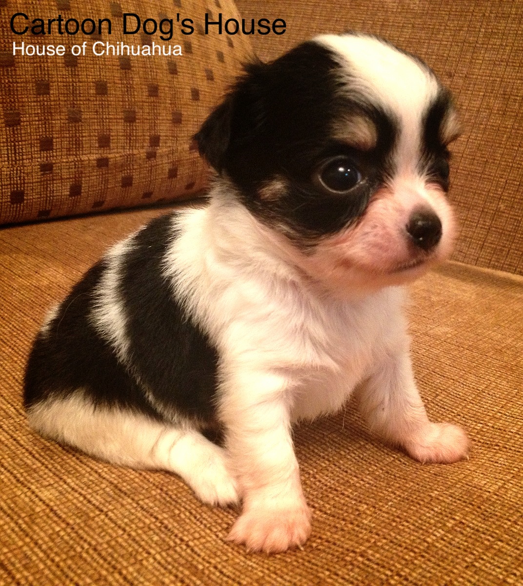 Cartoon Dog's House : ชิวาวาเพศผู้ ขนยาว สีขาวดำ มีคิ้วมีแก้ม หน้าตาแบ๊วๆ ราคาเบาๆ