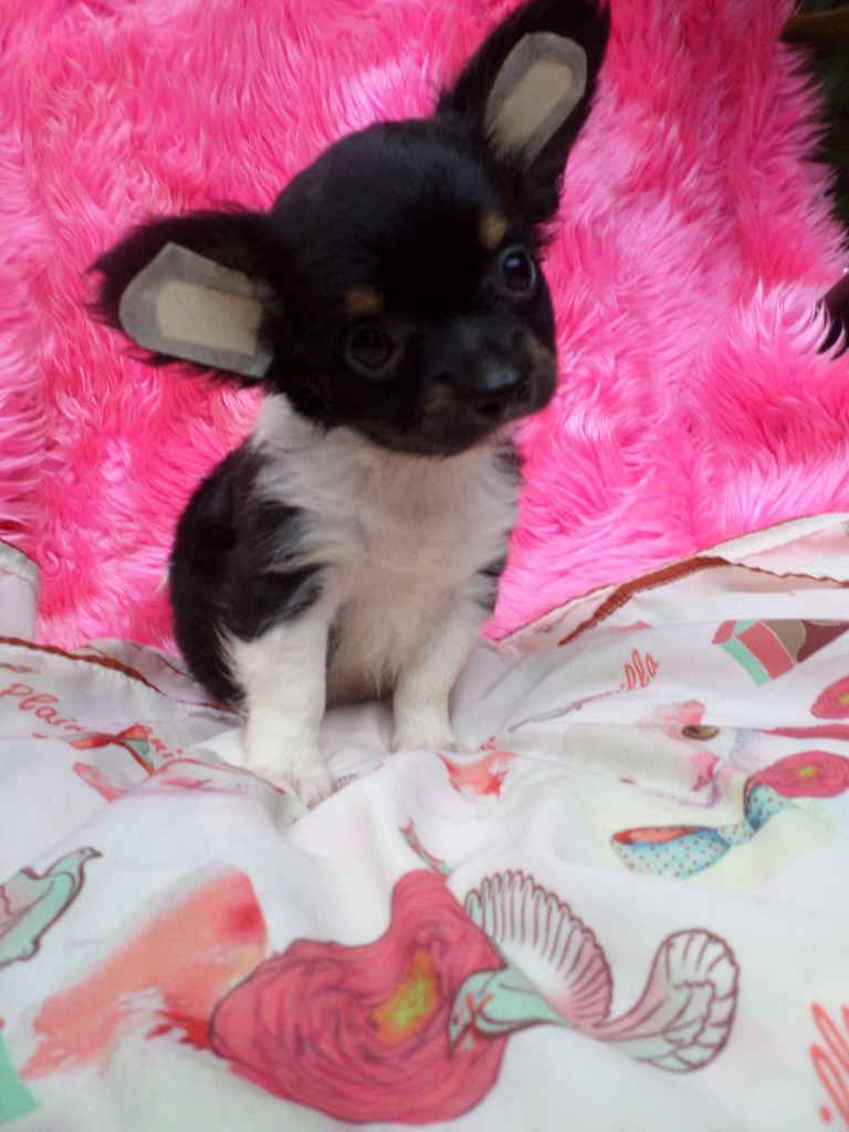 ดญ ป๊อกกี้ ชิวาวาขนยาว สีแฟนซีขาวดำมีคิ้วใส่ถุงเท้า