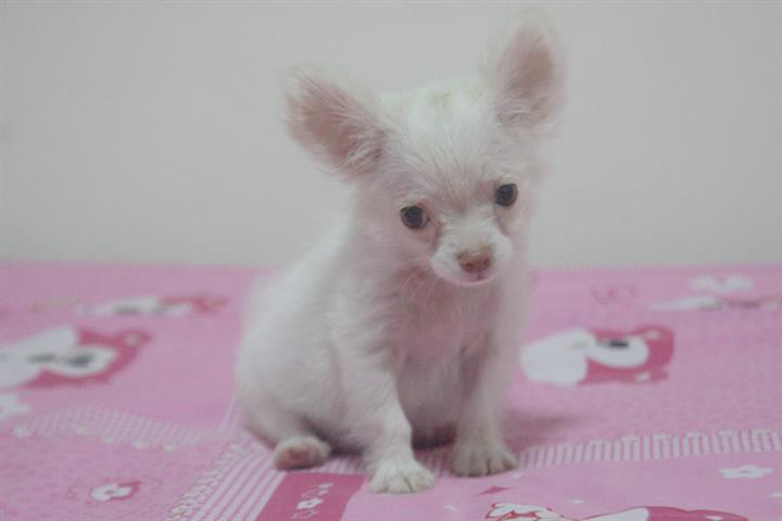 ขายชิวาวาขนยาวสีขาว (ติดครีมที่หู) เพศชาย ราคาถูกเพียง 4000 บาทพร้อมใบเพ็ด