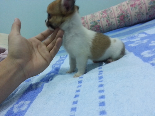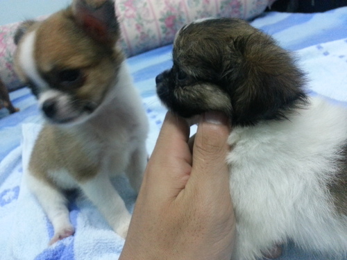 ตัวที่สาม ขาว-น้ำตาล(มั่ง ดูไม่ออก แต่น่าจะ ขาวน้ำตาล ยังกะลูกชิสุฮาๆ) เพศผู้