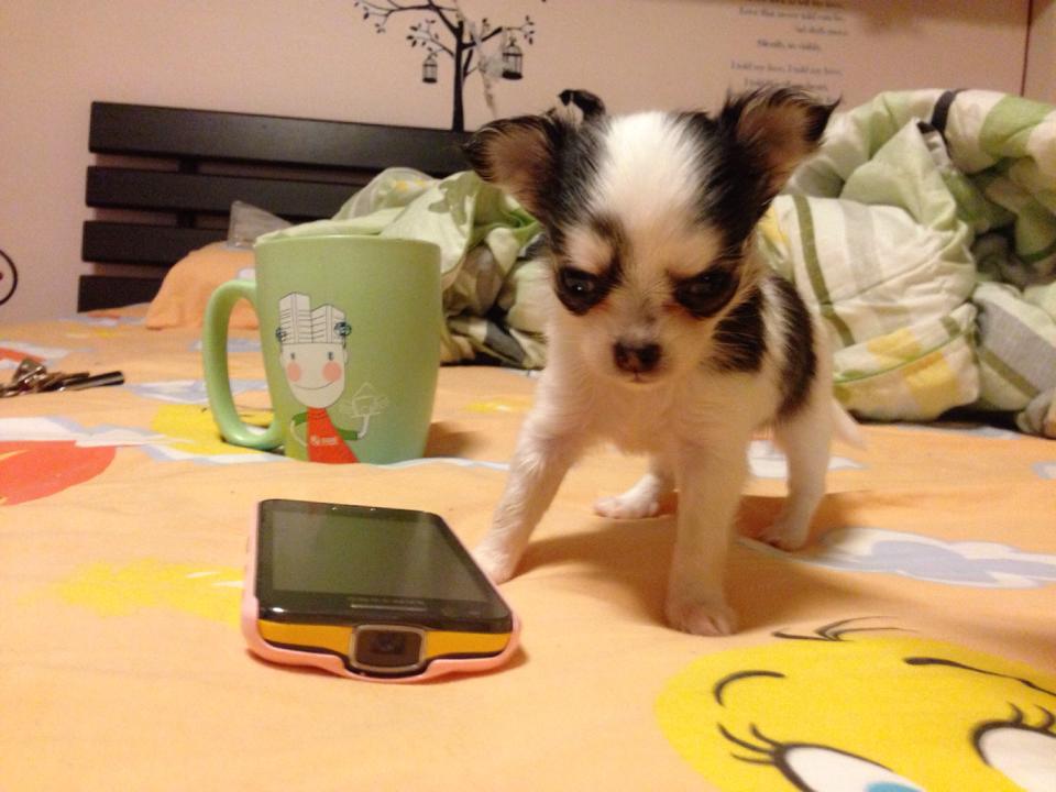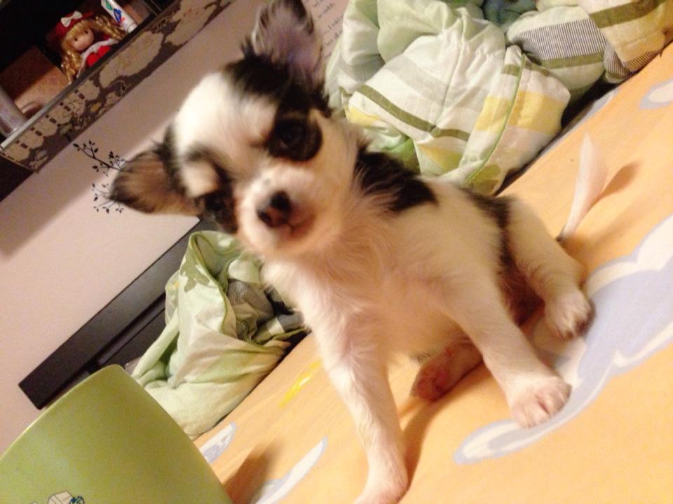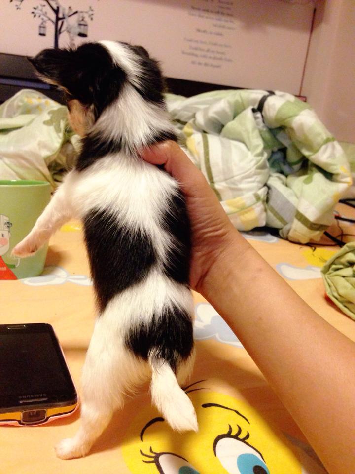 ชิวาวาขนยาว(น้องเคฟล่า)สายใต้หวัน สีแฟนสีขาว-ดำ ลายลูกวัว หน้าสั้น หัวแอปเปิเล มีมาร์กหัวใจข้างลำตัว มีคิ้ว มีแก้ม เพศเมีย ไซด์เล็กจิ๋ว เกิด 15 สค. 56 ทานเก่ง ขี้เล่น บ้าพลังมากๆ ขี้อ้อน ติดคนมาก ถ่ายพยาธิ+ฉีดวัคซีน 1เข็มแล้วคะ