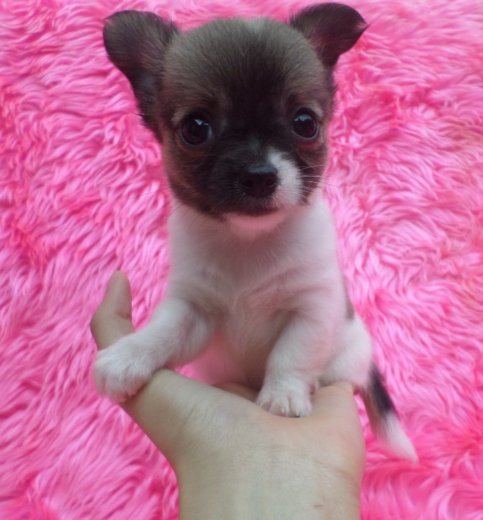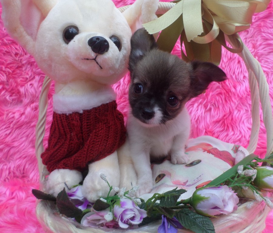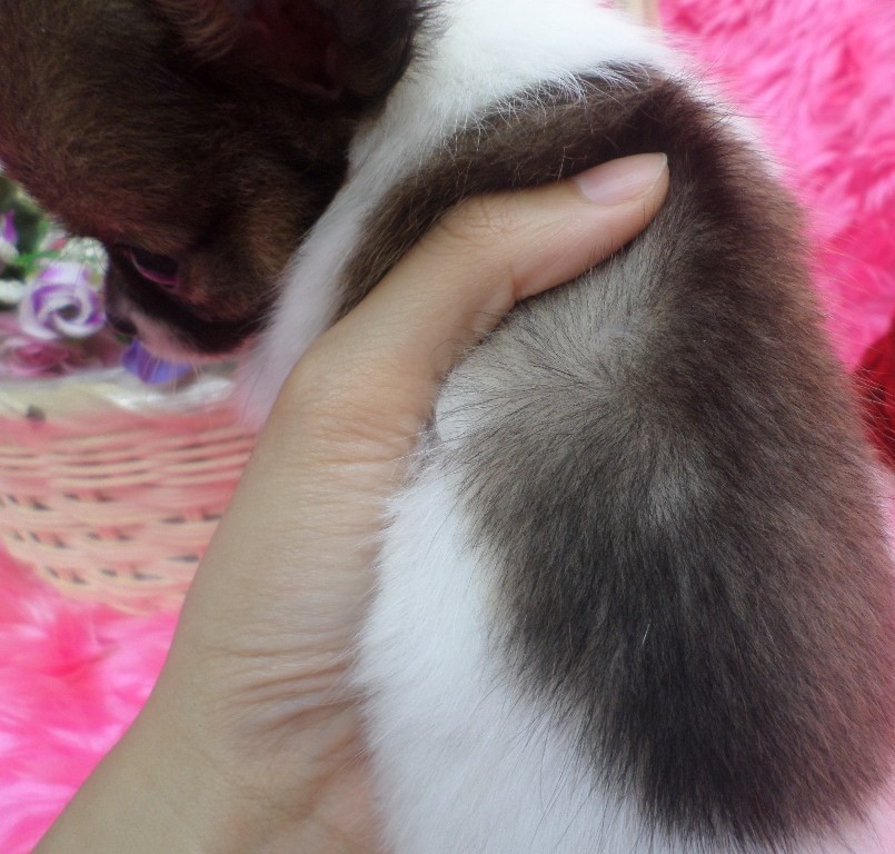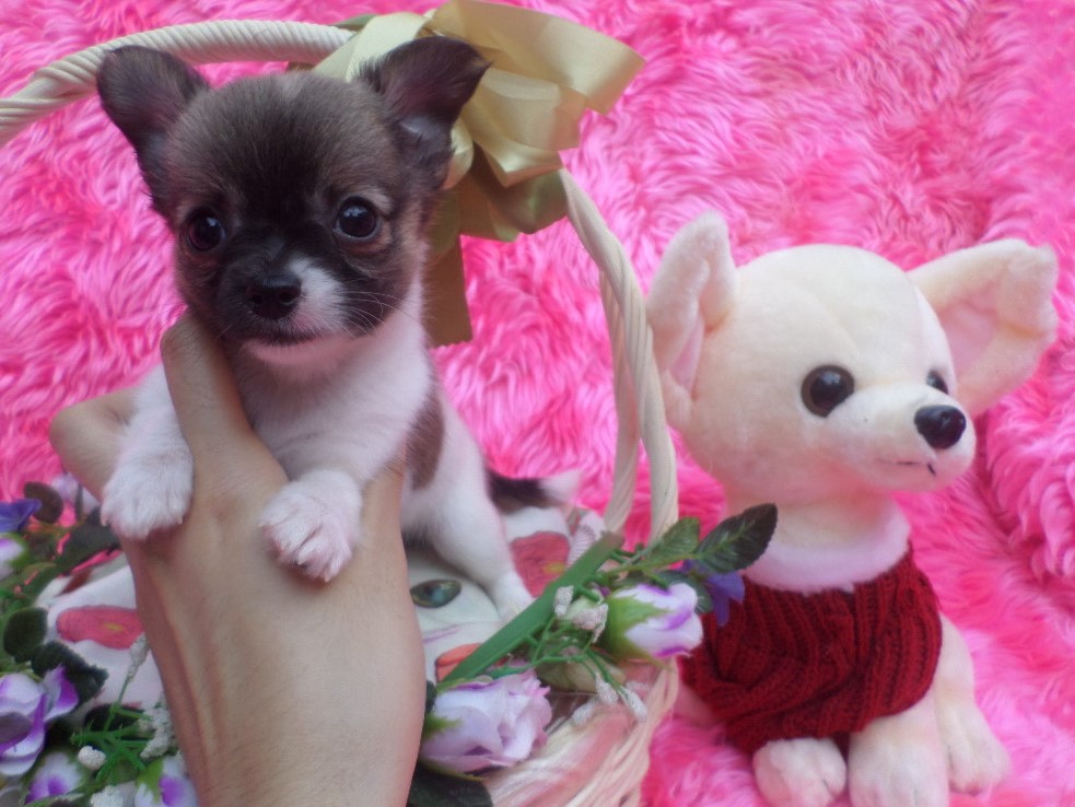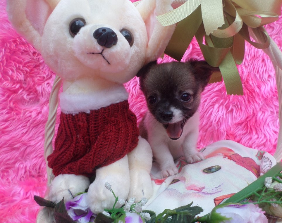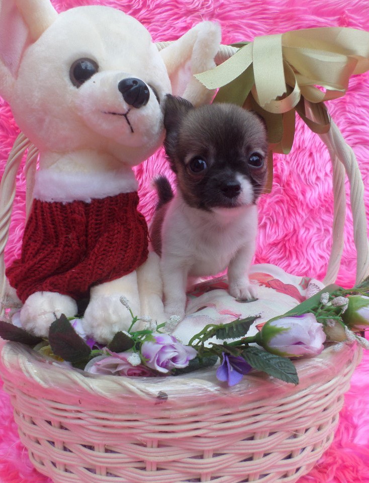 ชิวาวาขนยาว เพศผู้ ไซส์กลางถึงเล็ก สีแฟนซี ขาวแต้มน้ำตาลเข้ม เมื่อโตขึ้น สีขนจะผลัดเป็นสีน้ำตาลโทนอ่อนลงค่ะ ตามโคนขนน้องเขา
