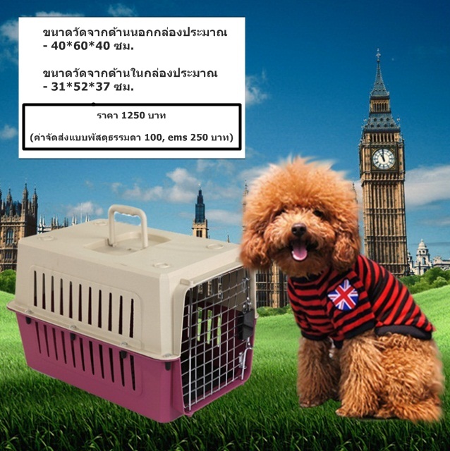 กล่องใส่สุนัขและแมวสำหรับเดินทาง สามารถใช้ขึ้นเครื่องบินได้ตามที่สายการบินกำหนด ตัวล็อคประตูเป็นชนิดบีบ เปิดปิดง่าย ประตูกรงด้านหน้าเป็นโลหะ มีหูหิ้วพลาสติก ด้านข้างมีช่องระบายอากาศ