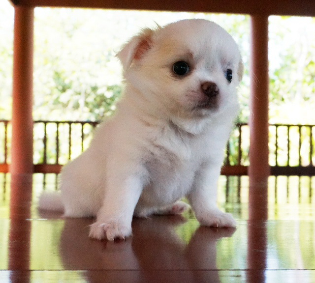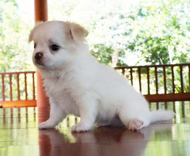 ชิวาวาขนยาว "น้องคาโอ" เพศผู้ สีขาว-ครีม