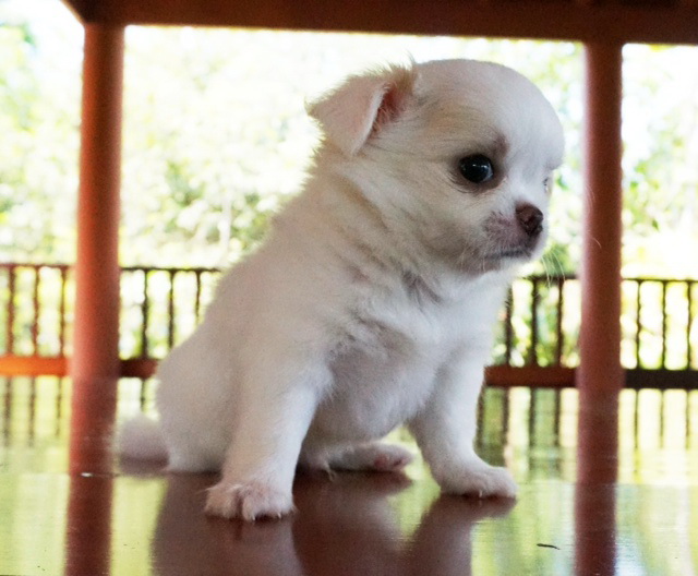 ชิวาวาขนยาว "น้องคาโอ" เพศผู้ สีขาว-ครีม