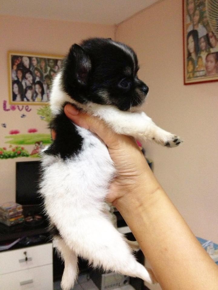 ชิวาวาขนยาว(น้องเบิร์ดเดย์)สายใต้หวัน สีขาว-ดำ มีคิ้ว มีแก้ม ไซด์ทีคัพ ขนแน่นเว่อร์ๆ ตัวสั้นกระปุ๊กลุก ทรงสวยเทพๆ หน้าสั้น หัวกลมใหญ่เป็นแอปเปิ้ล เพศเมีย เกิด 27 มิ.ย. 56 ขาสั้น แข็งแรง น่ารัก ติดคน ขี้เล่น ฉลาดฝุดๆ ทานเก่ง ถ่ายพยาธิ+วัคซีน1เข็ม ฝึกขับถ่ายเป็นที่แล้วคะ