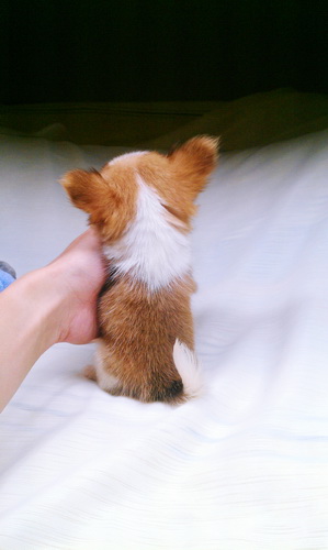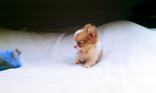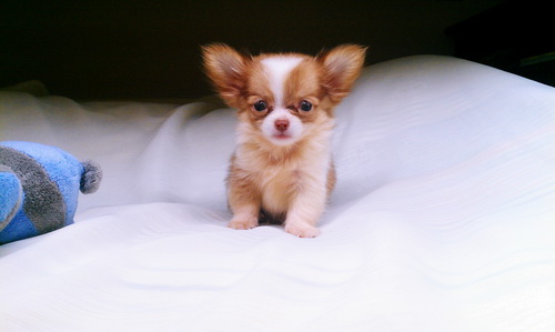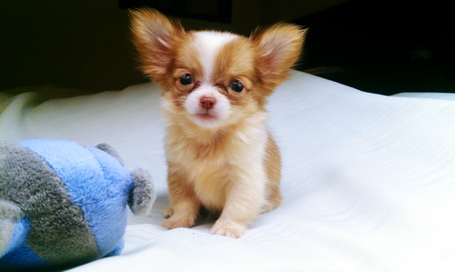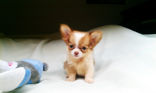 น้องแอลฟี่ ชิวาวาขนยาว สีน้ำตาลมาร์คขาว ไซส์ทีคัฟพร้อมใบรับรองจากสมาคม