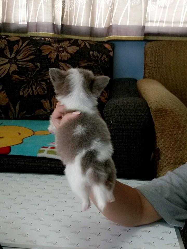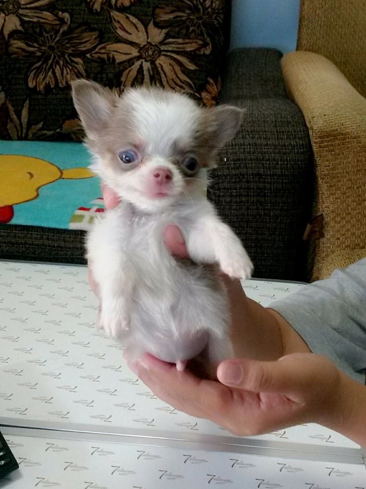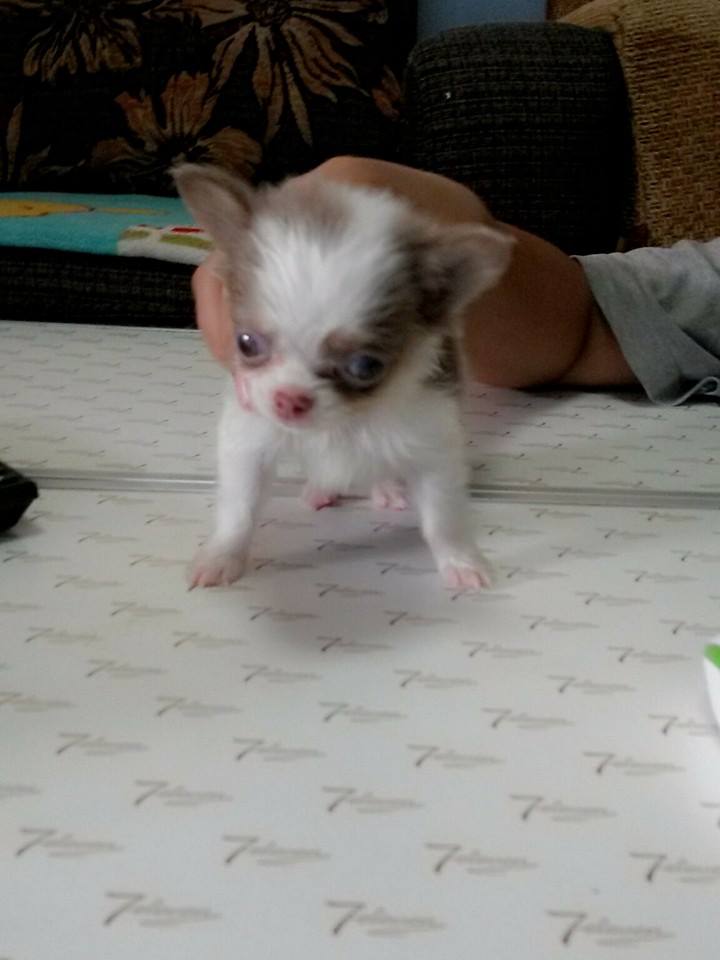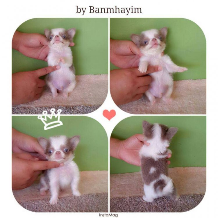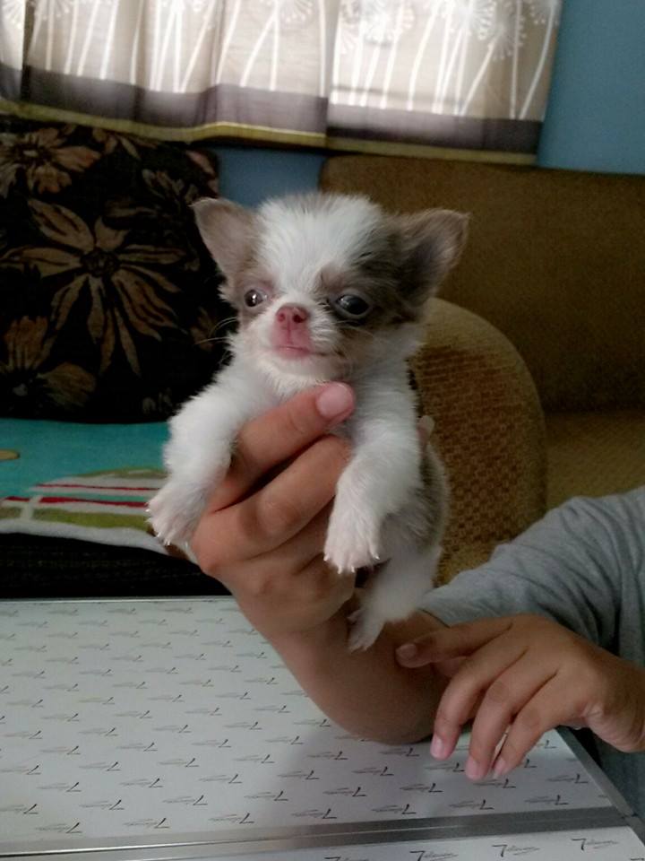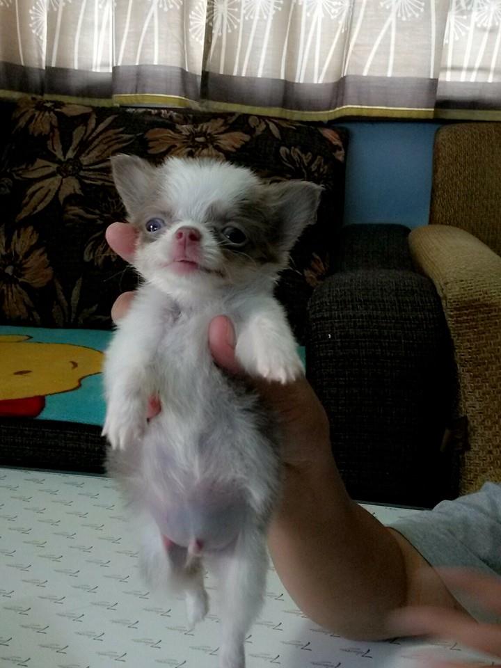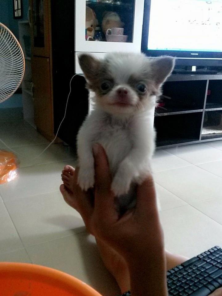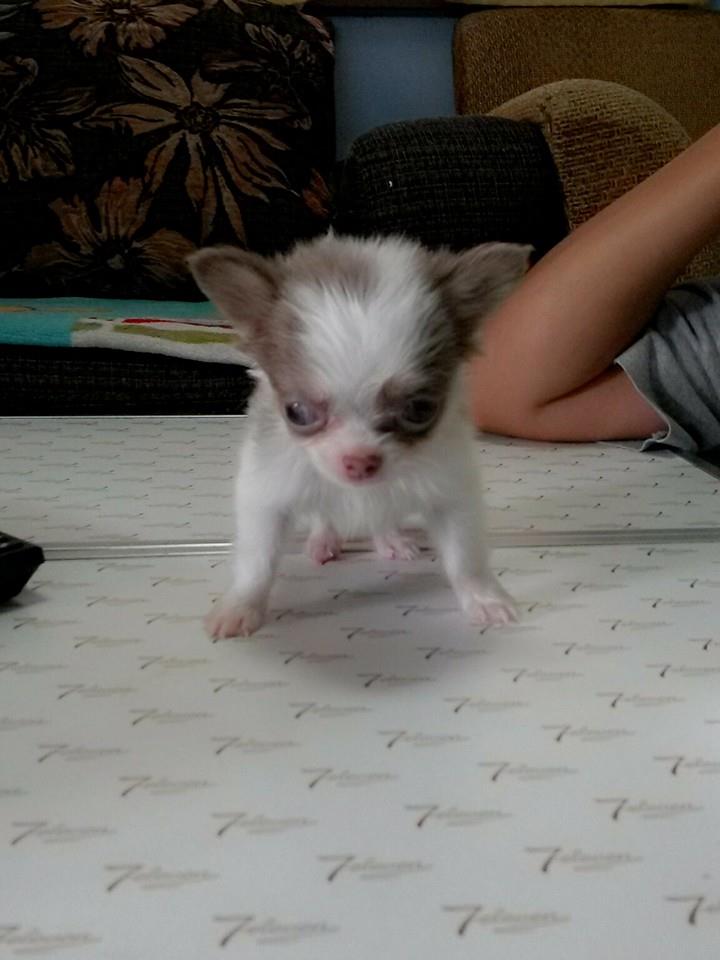 ชิวาวาขนยาวไซส์เล็กๆจิ๋วๆ เพศผู้ สีขาว-ช็อคอ่อน น้อง"ดีเซล" หัวโตแอ๊ปเปิ้ล