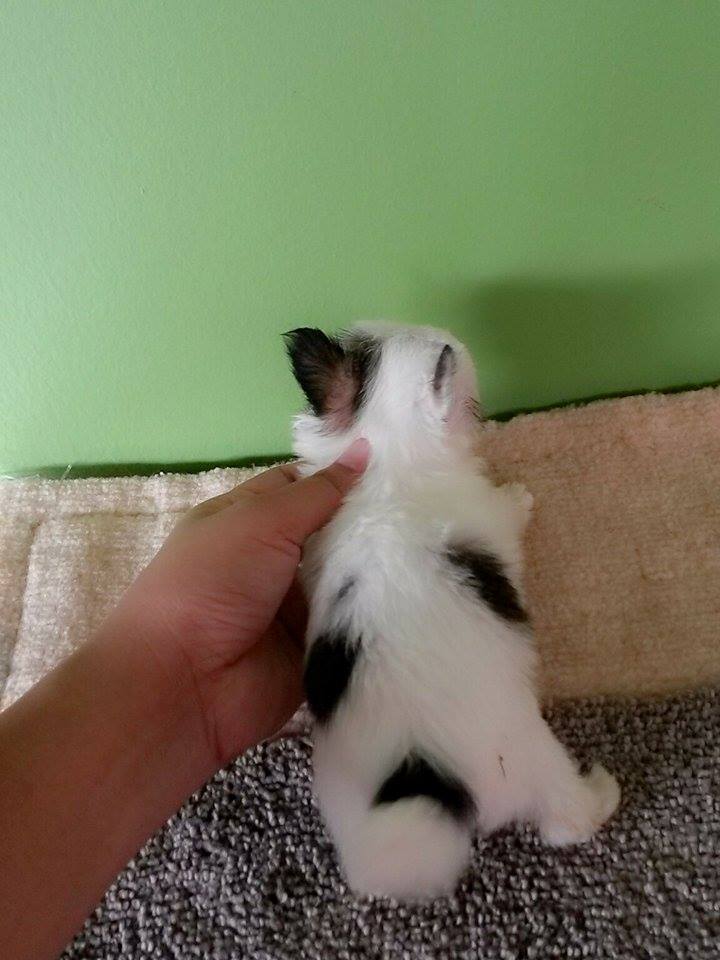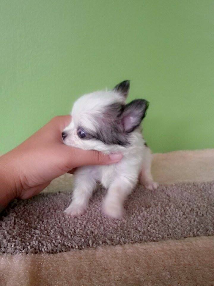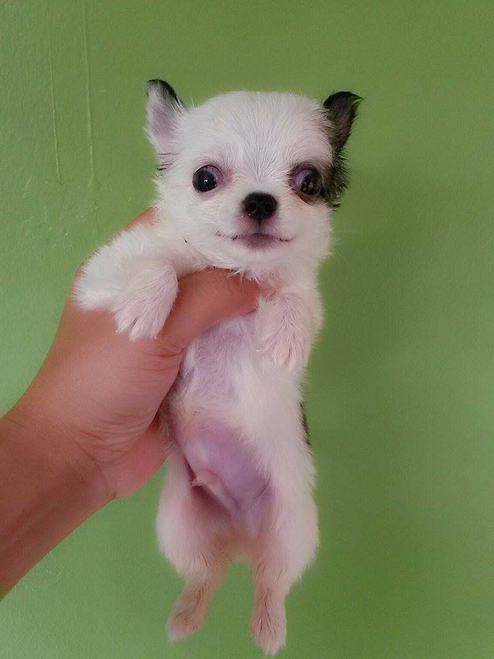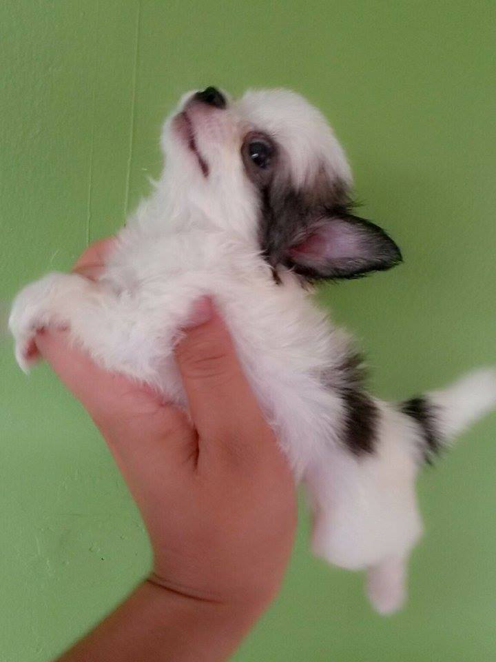 ชิวาวาขนยาวไซส์เล็กๆจิ๋วๆ เพศผู้ สีขาว-ดำ น้อง"เบนซิน" หัวโตแอ๊ปเปิ้ล ขาสั้น