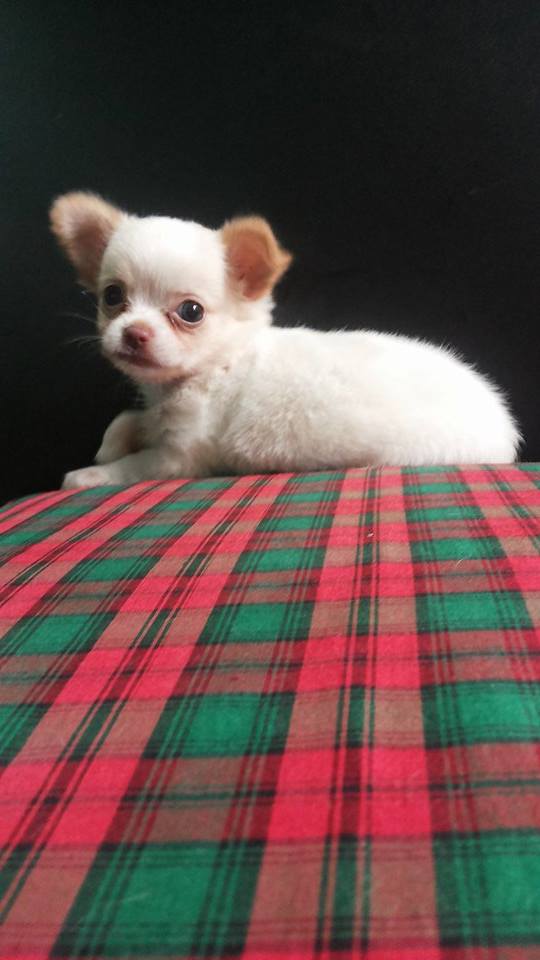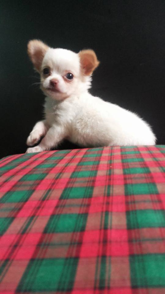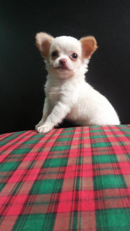 ชิวาวาขนยาวเพศผู้ สีขาวหูแต้มน้ำตาล ตัวเล็ก แข็งแรง น้องหมาพร้อมย้ายบ้านแล้ว