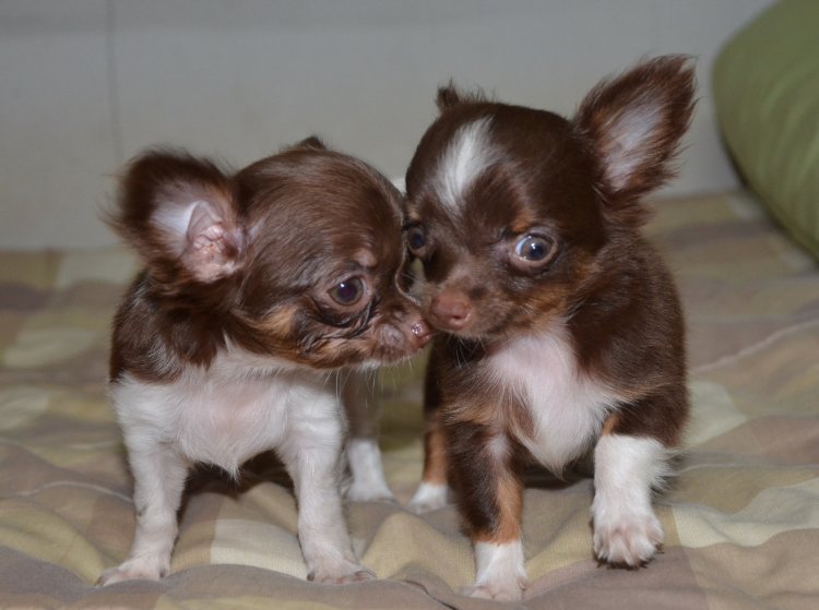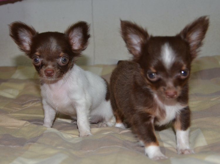 ลูกชิวาว่าขนาดเล็กมาก ขนยาว สีช็อกโกเลค อายุ 2 เดือน สีลายขาวเพศเมีย สีช็อกเพศผู้