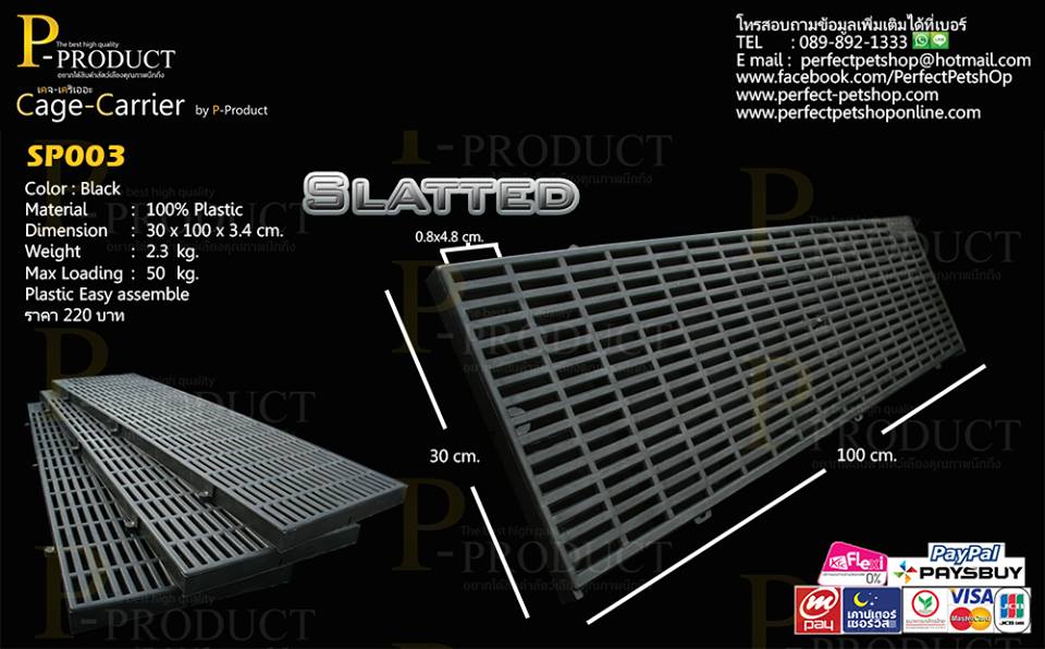 รหัสสินค้า SP003 สแลทพลาสติกกันลื่นสีดำ ขนาด 30 x 100 x 3.4 cm. ราคา 220 บาท ทำความสะอาดง่ายใช้รองพื้นคอก กรง และใช้งานประโยชอื่นๆ อีกมากมายผลิตจากพลาสติกคุณภาพสูงเหนียวทน ไม่แตกไม่กรอบง่าย ซื้อเยอะลดเยอะค่ะ ส่งได้ทั่วประเทศ รวมถึงต่างประเทศ ยินดีรับบัตรเครดิต โทรสอบถามส่วนลดได้คะ