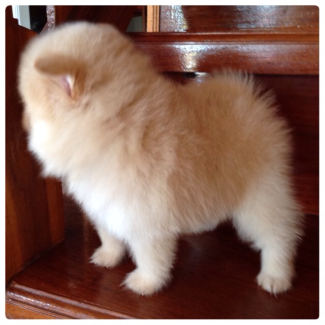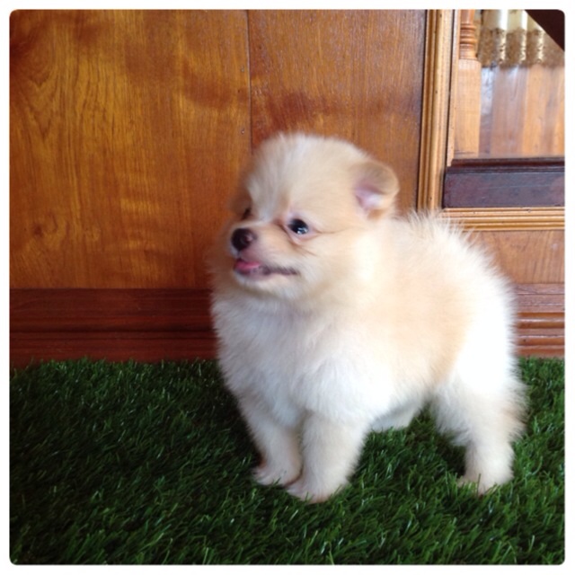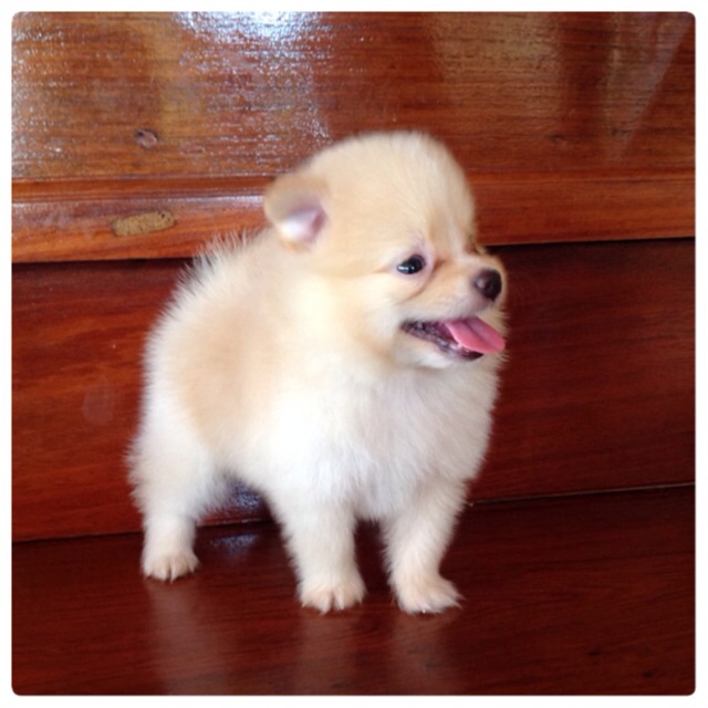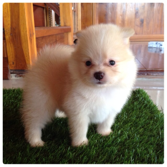 น้องปอมเมอเรเนียน เพศผู้ สีครีม ไซส์เล็ก ขนฟูหนา ขาใหญ่ วัยกำลังซน อายุ 45 วัน