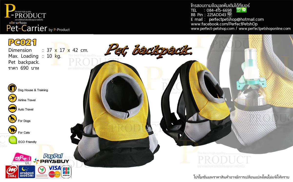 รหัสสินค้า PC 021 Pet Backpack กระเป๋าเดินทางสัตว์เลี้ยงขนาดกลาง พับเก็บได้ มีให้เลือก 3 สี ชมพู น้ำเงิน เหลือง รับน้ำหนักได้ 10 kg. ขนาดโดยประมาณ 37ก x 17ย x 42ส cm. ราคา 690 บาท กระเป๋าเดินทางสัตว์เลี้ยงขนาดกลางสะดวกในการพกพายืนสบาย นั่่งสบายมีที่เก็บของด้านข้าง ช่องสำหรับให้โผล่หัวชมวิวปรับความกว้างได้ และสายสะพายสามารถปรับระดับได้ จะสะพายท่าไหนก็สะบายๆไปทุกทีกับ PET BACKPACK เหมาะกับสุนัขขนาดเล็ก เช่น Chihuahau,Jack Russell,Pekingese,Pug,West Highland,Pomeranianหรือสัตว์เลี้ยงขนาดเล็กถึงขนาดกลางทุกชนิด หรือสัตว์เลี้ยงที่มีขนาดเหมาะสมทุกชนิด กระเป๋าเดินทางสัตว์เลี้ยงคุณภาพจาก P-PRODUCT