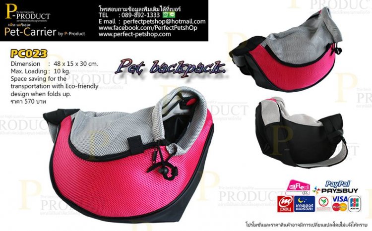รหัสสินค้า PC 023 Pet Backpack กระเป๋าเดินทางสัตว์เลี้ยงแบบสายเดี่ยวขนาดกลาง พับเก็บได้ มีให้เลือก 3 สี ชมพู น้ำเงิน เหลือง รับน้ำหนักได้ 8-10 kg. ขนาดโดยประมาณ 48ก x 15ย x 30ส cm. ราคา 570 บาท กระเป๋าเดินทางสัตว์เลี้ยงขนาดกลางสะดวกในการพกพา ยืน นอน นั่ง จะท่าไหนๆก็สบาย พร้อมมีที่เก็บสัมภาระด้านหน้า ช่องสำหรับให้โผล่หัวชมวิว ชิวๆปรับความกว้างได้พร้อมตัวล๊อค และสายสะพายสามารถปรับระดับได้ เหมาะกับสุนัขขนาดเล็ก เช่น Chihuahau,Jack Russell,Pekingese,Pug,West Highland,Pomeranianหรือสัตว์เลี้ยงขนาดเล็กถึงขนาดกลางทุกชนิด หรือสัตว์เลี้ยงที่มีขนาดเหมาะสมทุกชนิด กระเป๋าเดินทางสัตว์เลี้ยงคุณภาพจาก P-PRODUCT