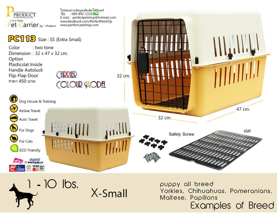 รหัสสินค้า PC 113 size SS กล่องเดินทางสัตว์เลี้ยงขนาด Small ขนาด 32ก x 47ย x 32ส cm. ราคา 450 บาท เหมาะกับสุนัขขนาดเล็ก เช่น Puppy or Chihuahau,Jack Russell,Pekingese,Pug,West Highland,Pomeranianหรือสัตว์เลี้ยงขนาดเล็กถึงขนาดกลางทุกชนิด หรือสัตว์เลี้ยงที่มีขนาดเหมาะสมทุกชนิด กล่องเดินทางสัตว์เลี้ยงคุณภาพจาก P-PRODUCT