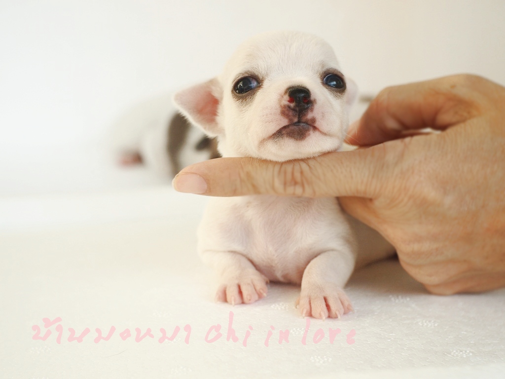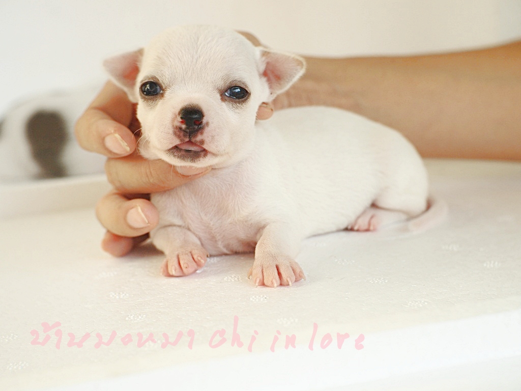 เด็กหญิง R2 ชิวาว่าขนสั้น สีขาวล้วน สินสอด 8500 (จองแล้วค่ะ)