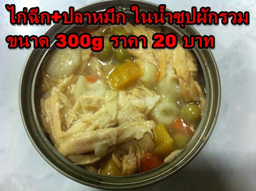 - ไก่ฉีก+ปลาหมึก ในน้ำซุปผักรวม ขนาด 300g ราคา กระป่องละ 20 บาท (สินค้ามีจำนวนจำกัด)