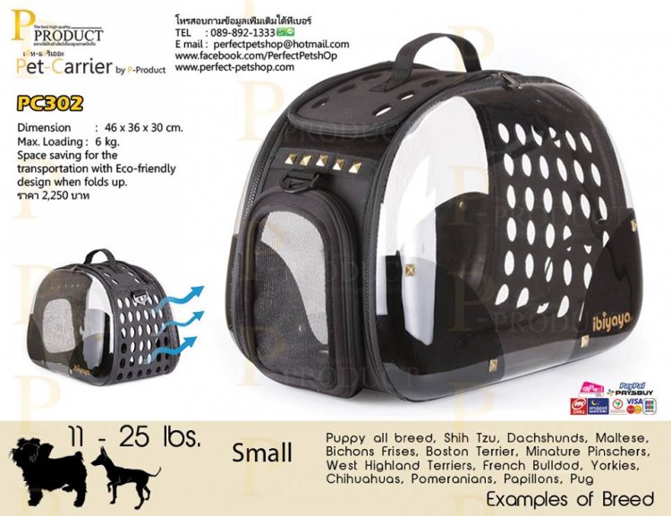 รหัสสินค้า PC302 กระเป๋าเดินทางสัตว์เลี้ยงอเนกประสงค์ ขนาดโดยประมาณ 46x36x30 cm. ราคา 2,250 บาท PC301 กระเป๋าเดินทางสัตว์เลี้ยงอเนกประสงค์ คลาสสิคสวยแบบมีสไตล์ด้วยพลาสติคโปร่งแสงเปิดฝาหน้าและฝาบนได้พับเก็บได้สะดวกสบายในการใช้งาน เหมาะกับสุนัขขนาดเล็ก หนึ่งในกระเป๋าเดินทางสัตว์เลี้ยงคุณภาพ By P-PRODUCT