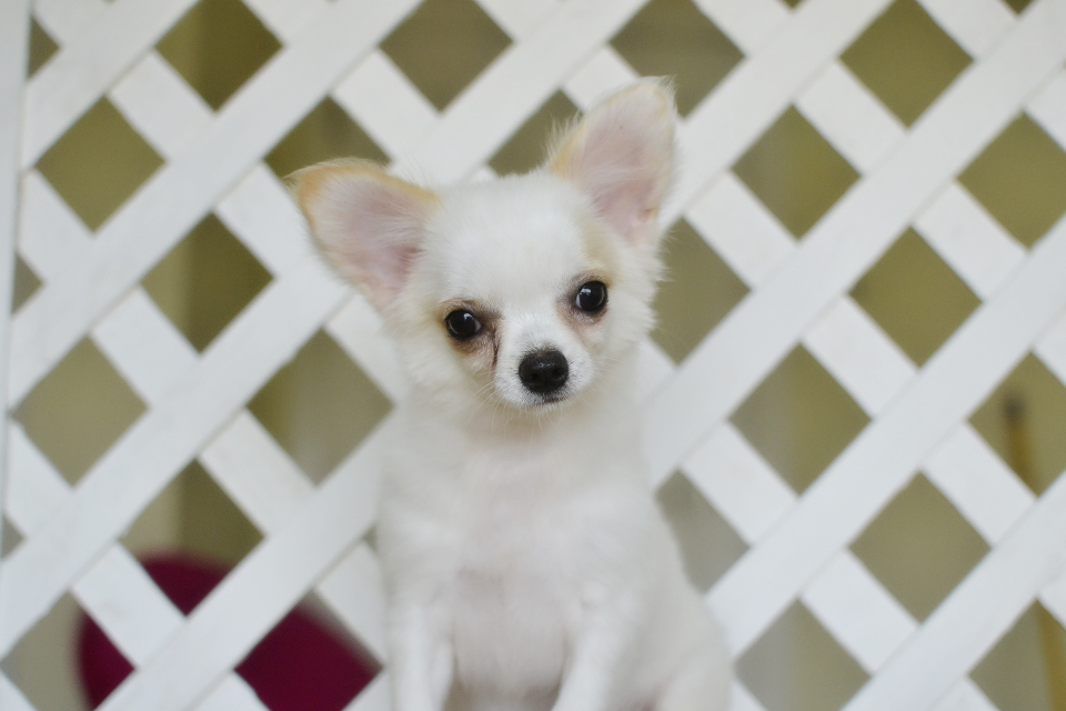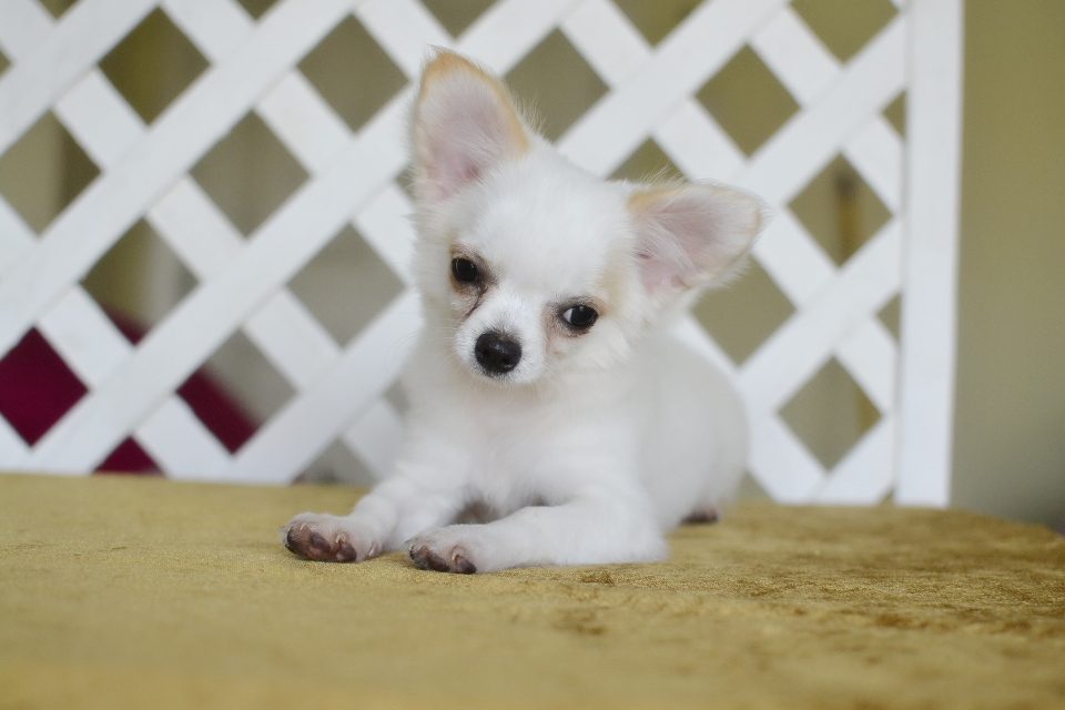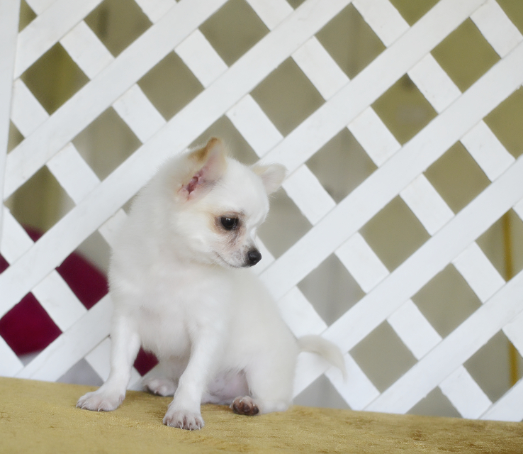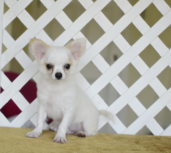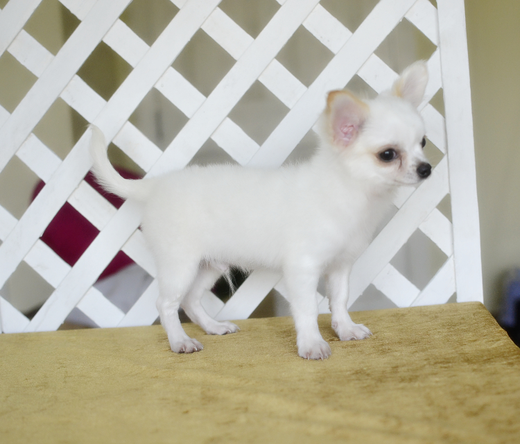 Chihuahuaสีขาวล้วนเพศผู้เกรดสวยขนยาวไซด์เล็กพร้อมย้ายบ้านมีบริการส่ง