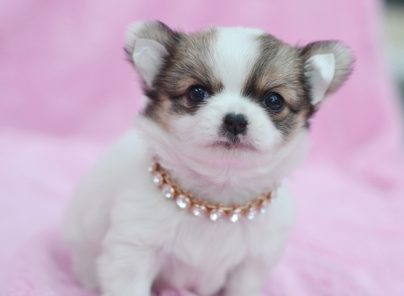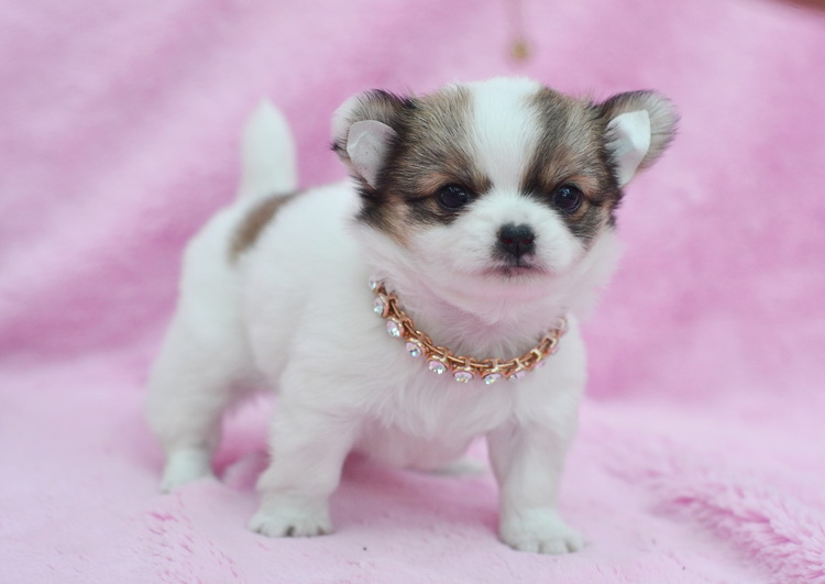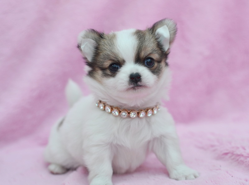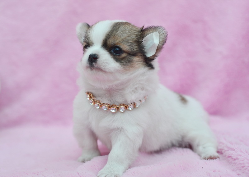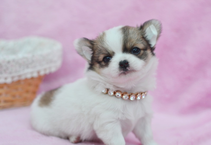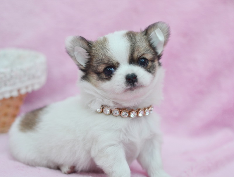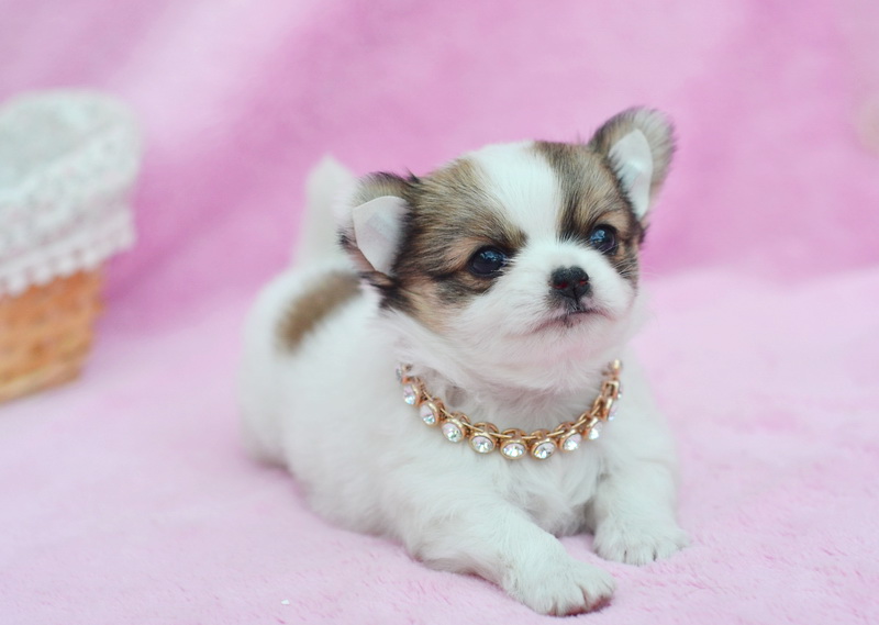 "น้องหนูมาลี" ชิวาวาเพศเมียขนยาวสีขาวน้ำตาล หน้าสั้นๆ หัวโต ขนแน่นๆ น่ารักมาก