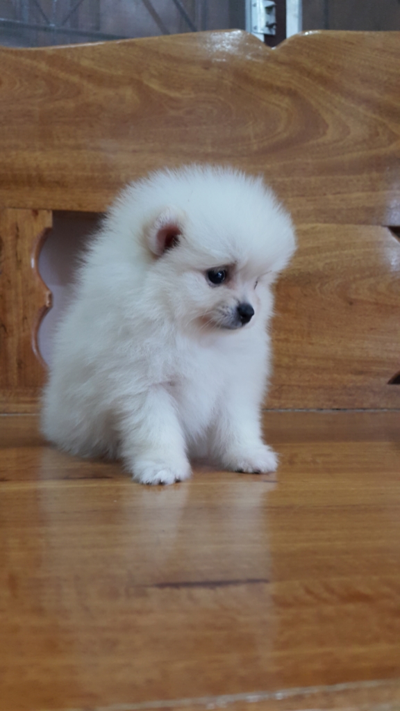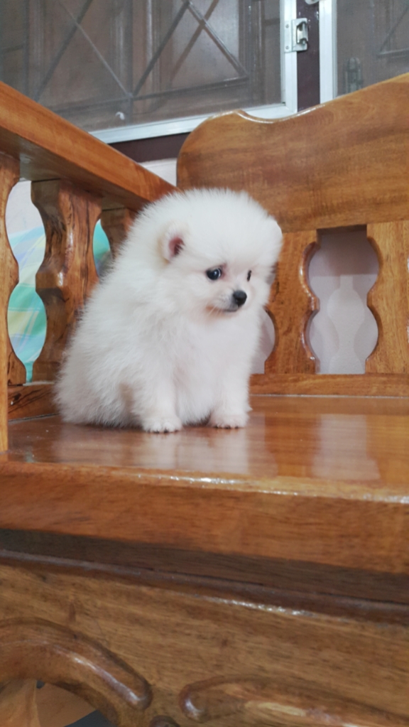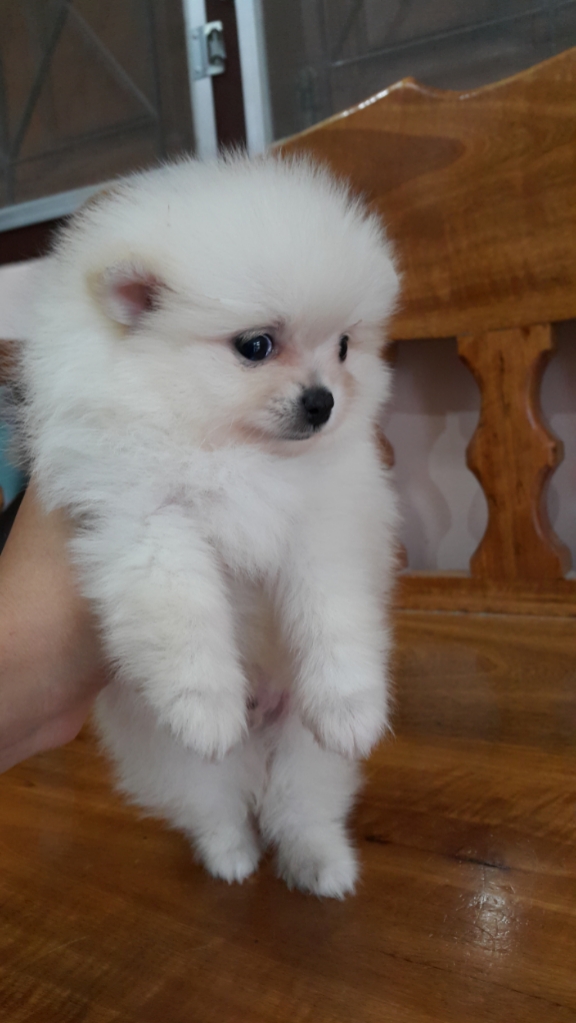ปอมเมอเรเนี่ยนแท้ สีขาว เพศผู้ไซส์เล็ก ฟรอมสวย หน้าสั้น จัดส่งได้ค่ะ