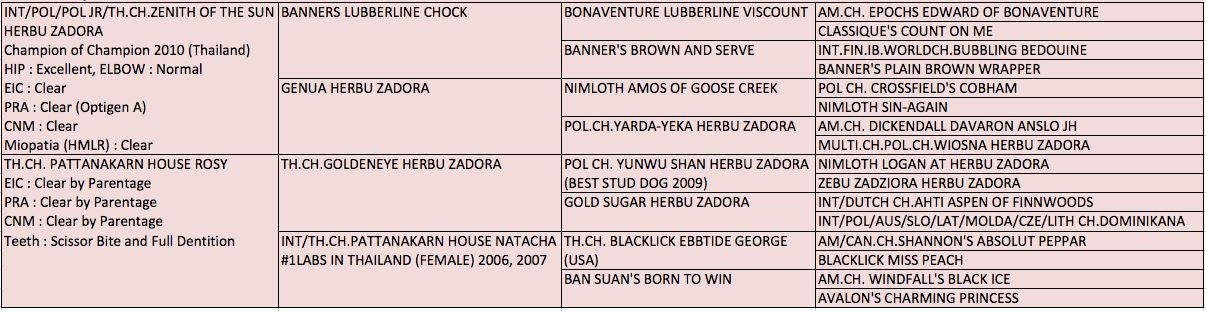 “ROSY” เป็นแม่พันธุ์ลาบราดอร์ดีกรีไทยแลนด์แชมป์และมีสายเลือดอเมริกันแชมป์ โครงสร้างสูงใหญ่ กระดูกใหญ่หัวสวย นิสัยเรียบร้อย อารมณ์ดี ซึ่งโครงสร้างนิสัยที่ดีเหล่านี้จะถ่ายทอดพันธุกรรมไปถึงลูกได้ดีด้วย