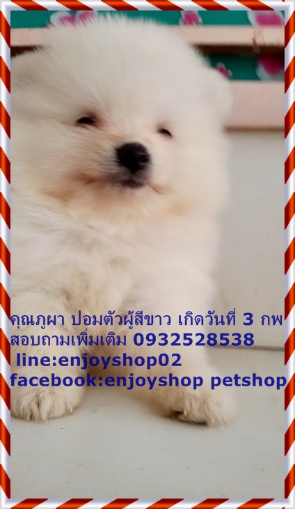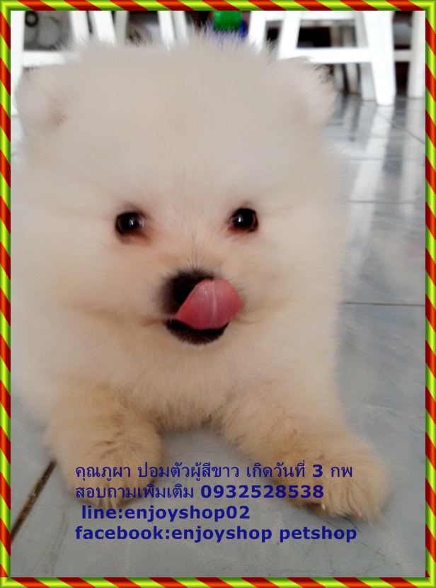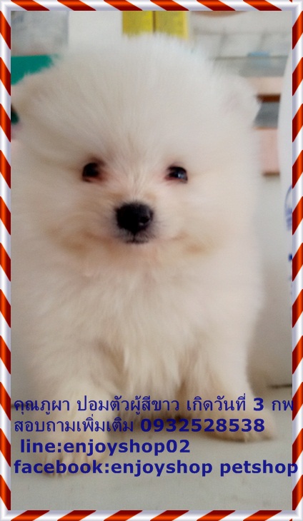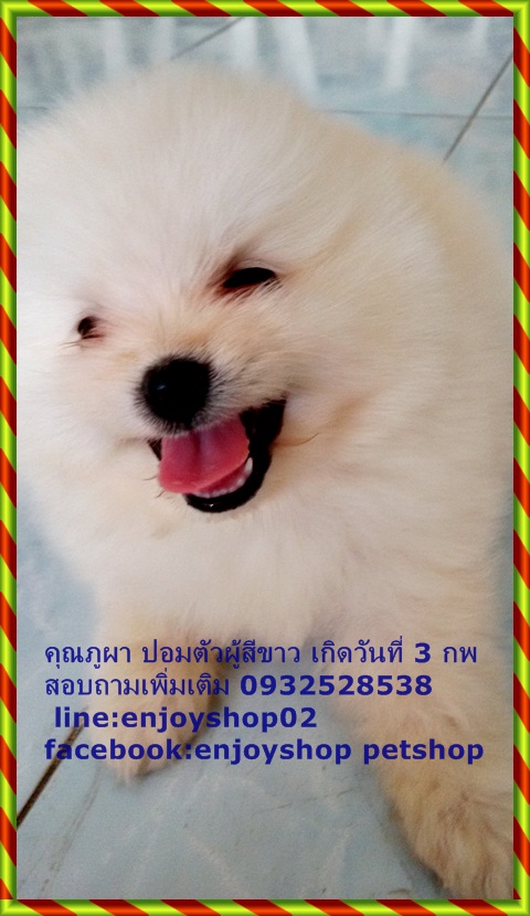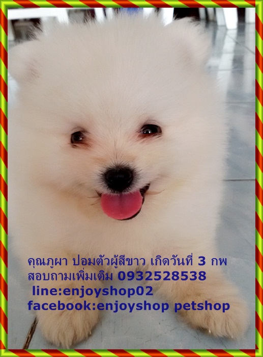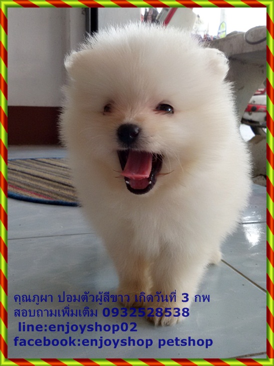 ภูผาปอมตัวผู้ไซด์เล้กสีขาว ขนแน่น ขาสั้นๆ ตัวเล็ก กินเก่งมาก ซนนิดหน่อย ภูผาฉลาดฟังภาษารู้เรื่อง ยิ้มเก่ง ขี้อ้อน ชอบอยู่กับคน ตอนนี้อายุได้ 40 วัน ถ่ายพยาธิแล้วค่ะ ราคา 8500 บาท พร้อมจัดส่งนะค่ะ ถ้ามารับเอง 7500 บาทค่ะ สอบถามรายละเอียดเพิ่มเติม 0932528538 line:enjoyshop02 facebook:enjoyshop petshop
